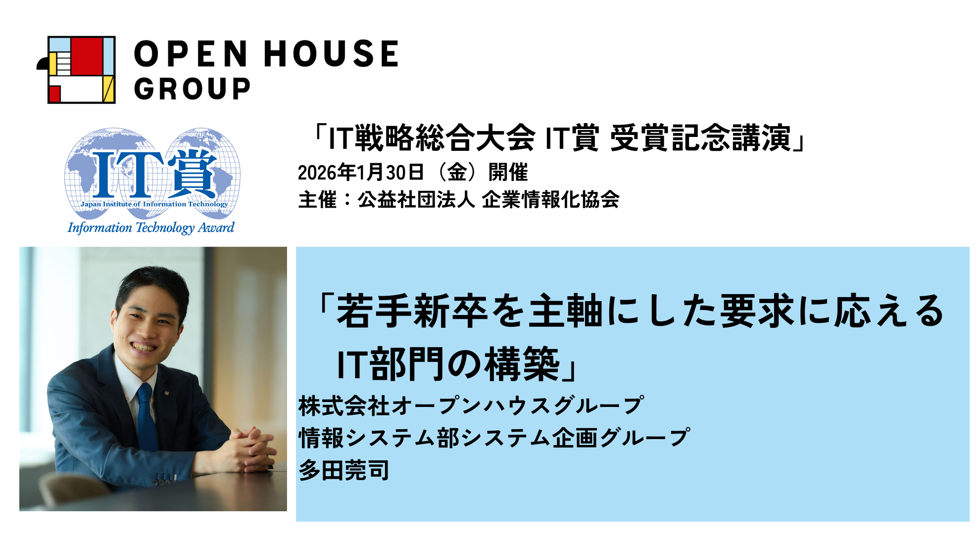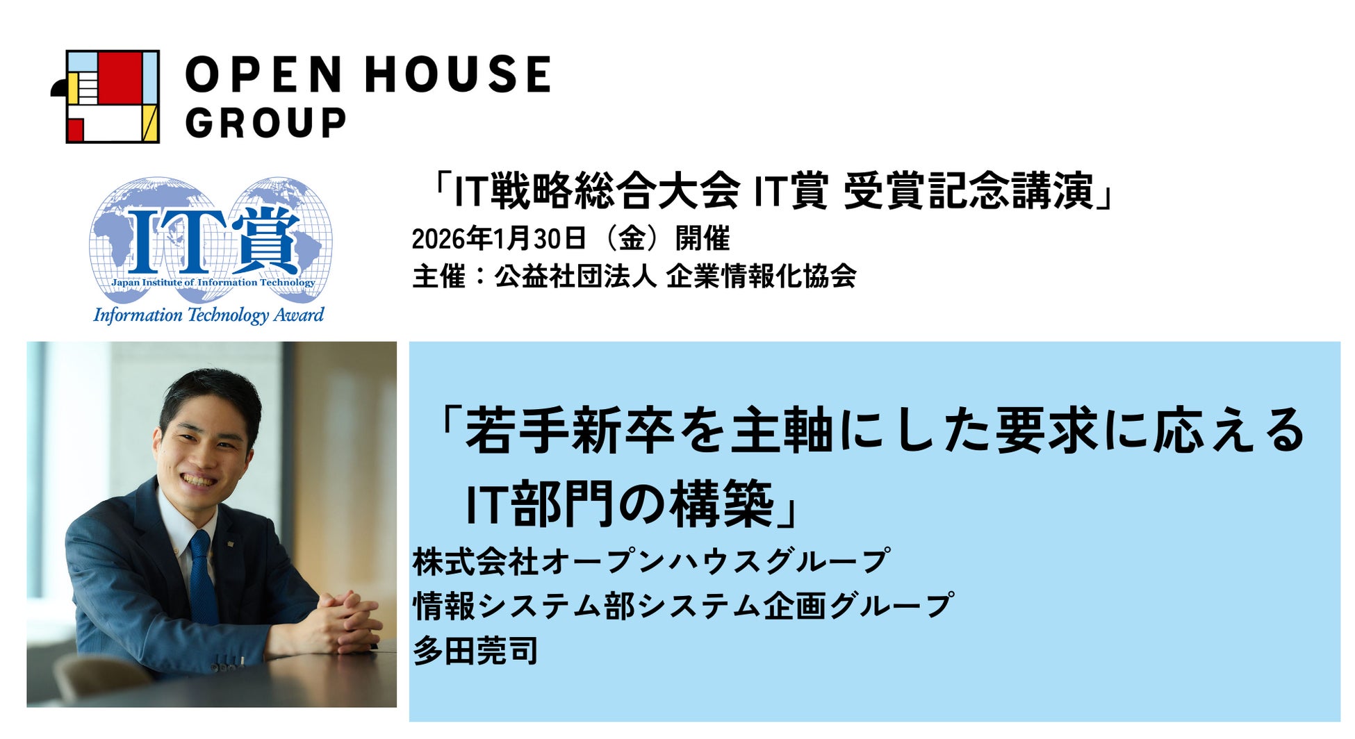 株式会社オープンハウスグループ(本社 東京都千代田区、代表取締役社長 福岡良介、以下「当社」)より、当社情報システム部システム企画グループの多⽥莞司が、2026年1月30日(金)に開催される「IT戦略総合大会 IT賞受賞記念講演」(主催:公益社団法人 企業情報化協会=IT協会)に登壇し、「若手新卒を主軸にした要求に応えるIT部門の構築」と題して、当社の取り組みについてお話させていただくことをお知らせいたします。