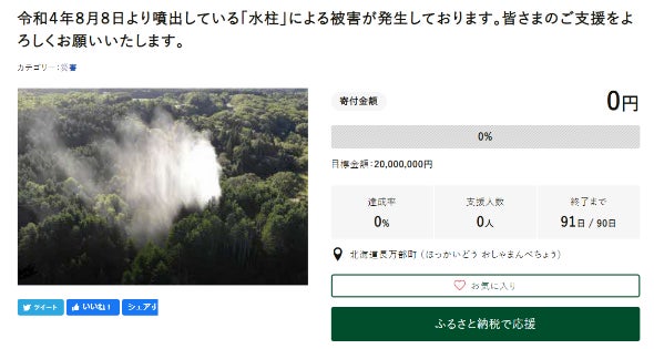 北海道長万部町(町長:木幡正志、以下「長万部町」)と国内最大級のふるさと納税総合サイト「ふるさとチョイス」( https://www.furusato-tax.jp/ )を企画・運営する、株式会社トラストバンク(本社:東京都渋谷区、代表取締役:川村憲一、以下「トラストバンク」)は、本日9月9日トラストバンクが提供する、ふるさと納税制度を通じてクラウドファンディング型で寄付を募る仕組み「ガバメントクラウドファンディング®」(以下「GCF®」)で、約1か月前から長万部町で噴出している「水柱」による、ごう音・噴出水対策を目的としたプロジェクトを開始します。募集期間は2022年9月9日~12月7日で、目標寄付金額は2,000万円です。