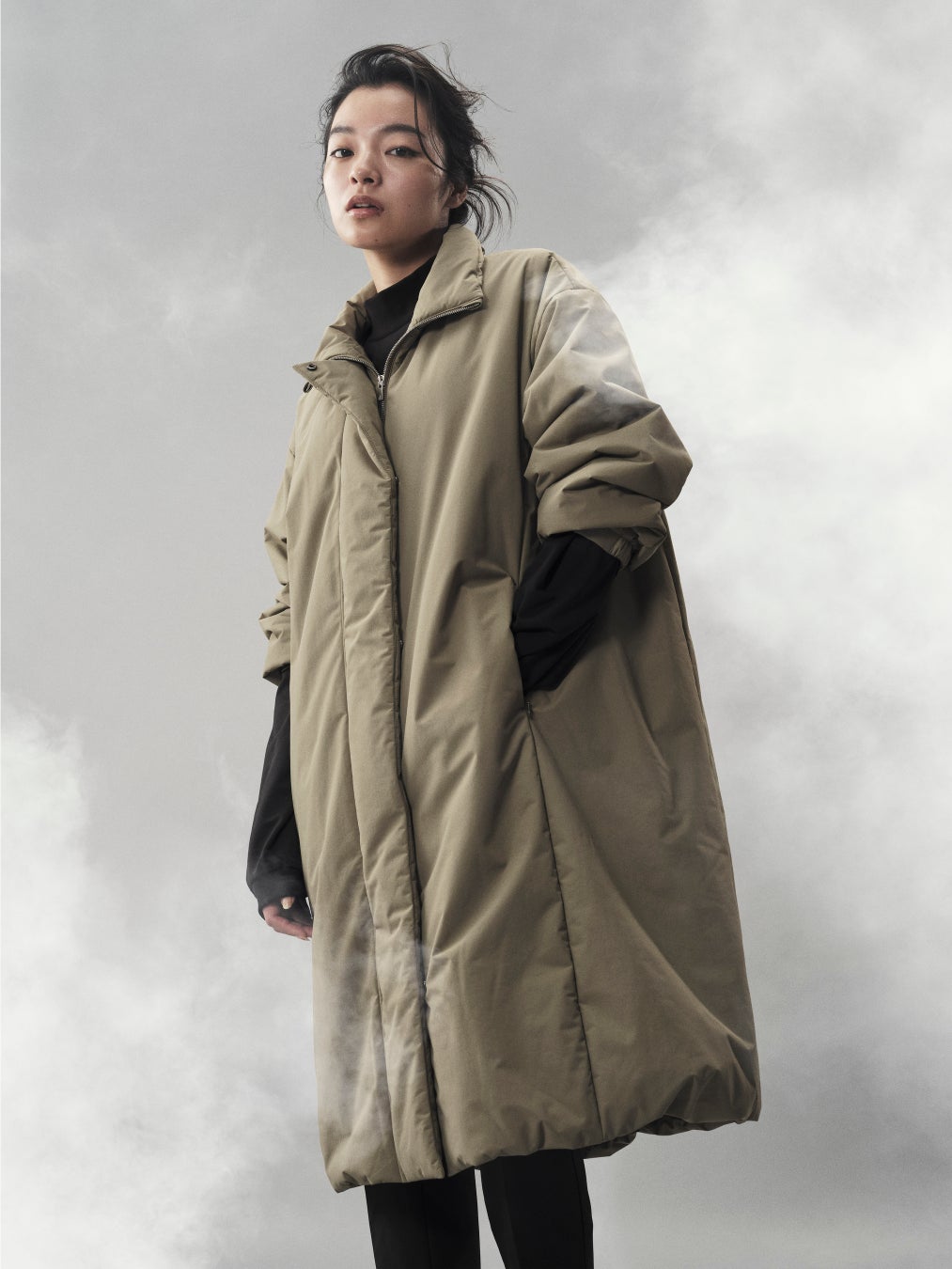丸みのあるコクーンシルエットがフェミニンなPRIMALOFT®採用のスタンドカラーコート。幅広い着こなしに合うミニマルなデザインとミリタリーテイストなカラーリング。防水性・防風性を高めた2レイヤー生地はハリがありながらも柔らかい素材感。