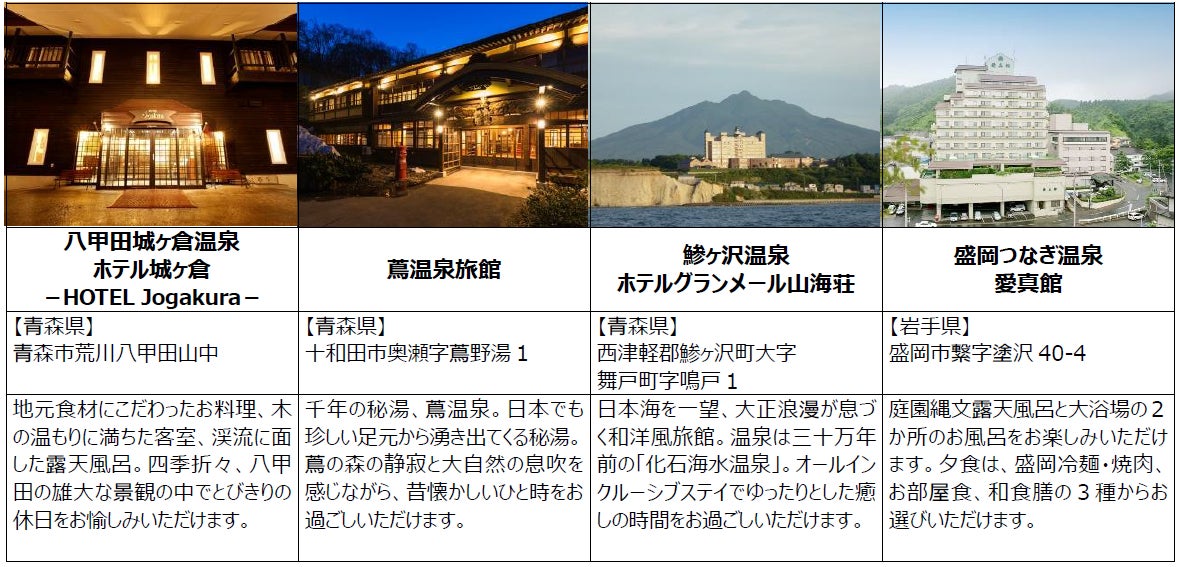 八甲田城ヶ倉温泉 ホテル城ヶ倉 / 蔦温泉旅館 / 鯵ヶ沢温泉 ホテルグランメール山海荘 |