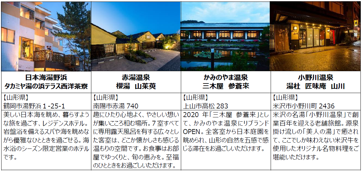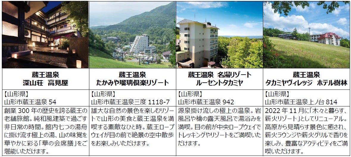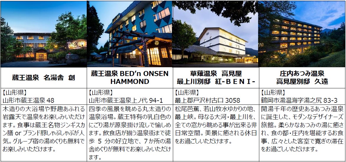蔵王温泉 深山荘 高見屋 / 蔵王温泉 たかみや瑠璃倶楽リゾート / 蔵王温泉 名湯リゾート ルーセントタカミヤ / 蔵王温泉 タカミヤヴィレッジ ホテル樹林 / 蔵王温泉 名湯舎 創 / 蔵王温泉 BED'n ONSEN HAMMOND / 草薙温泉 高見屋 最上川別邸 紅 / 庄内あつみ温泉 高見屋別邸 久遠 / 日本海湯野浜 タカミヤ湯の浜テラス 西洋茶寮 / 赤湯温泉 櫻湯 山茱萸 / かみのやま温泉 三木屋 参蒼来 / 小野川温泉 湯杜 匠味庵 山川 / 天童温泉 ほほえみの宿 滝の湯 / 湯野浜温泉 亀や |