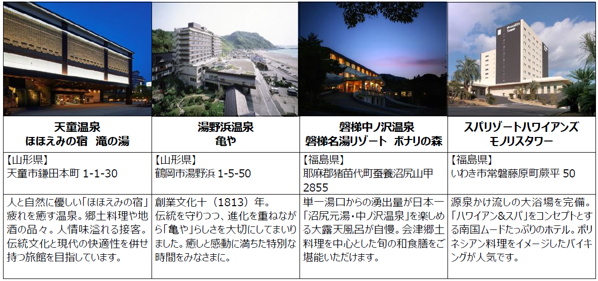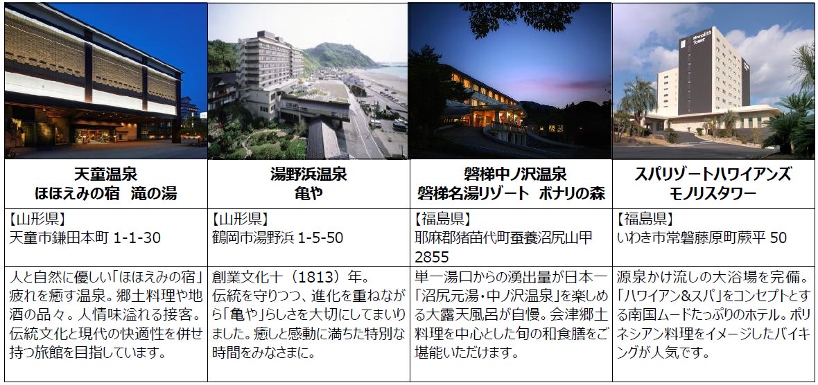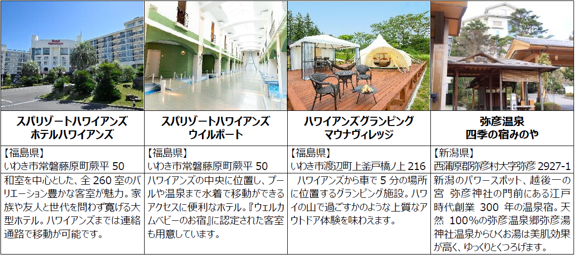 磐梯中ノ沢温泉 磐梯名湯リゾート ボナリの森 / スパリゾートハワイアンズ モノリスタワー / スパリゾートハワイアンズ ホテルハワイアンズ / スパリゾートハワイアンズ ウイルポート / ハワイアンズグランピング マウナヴィレッジ |