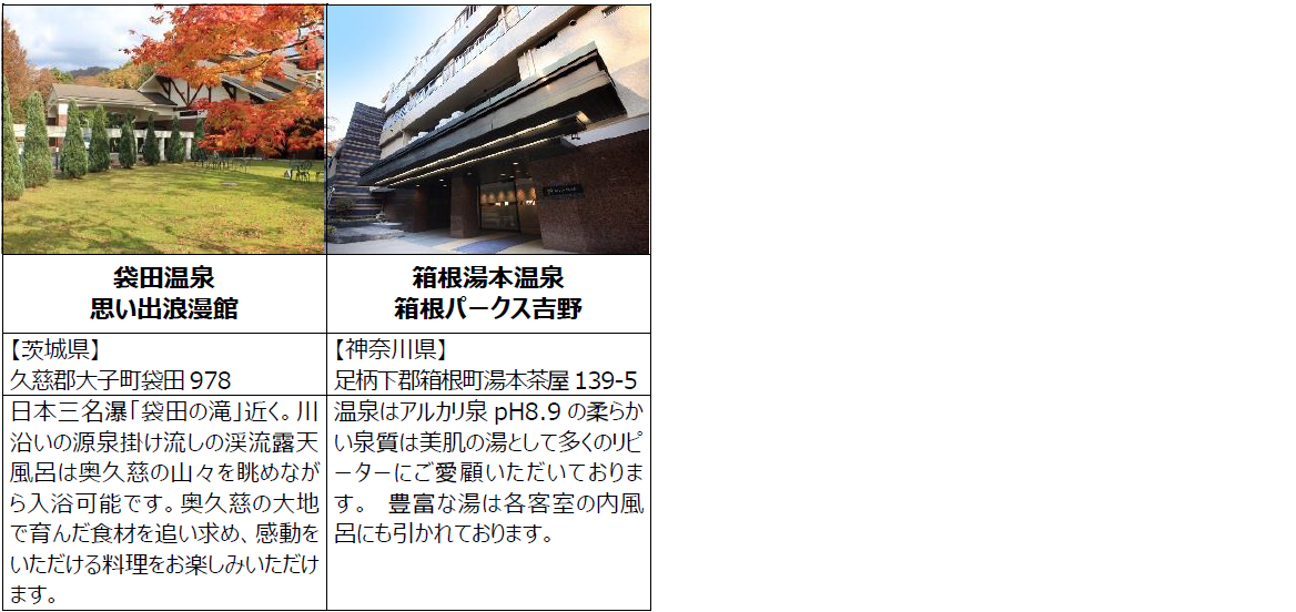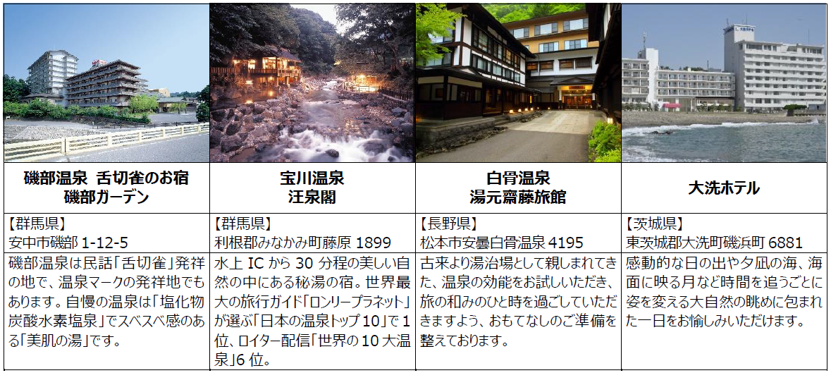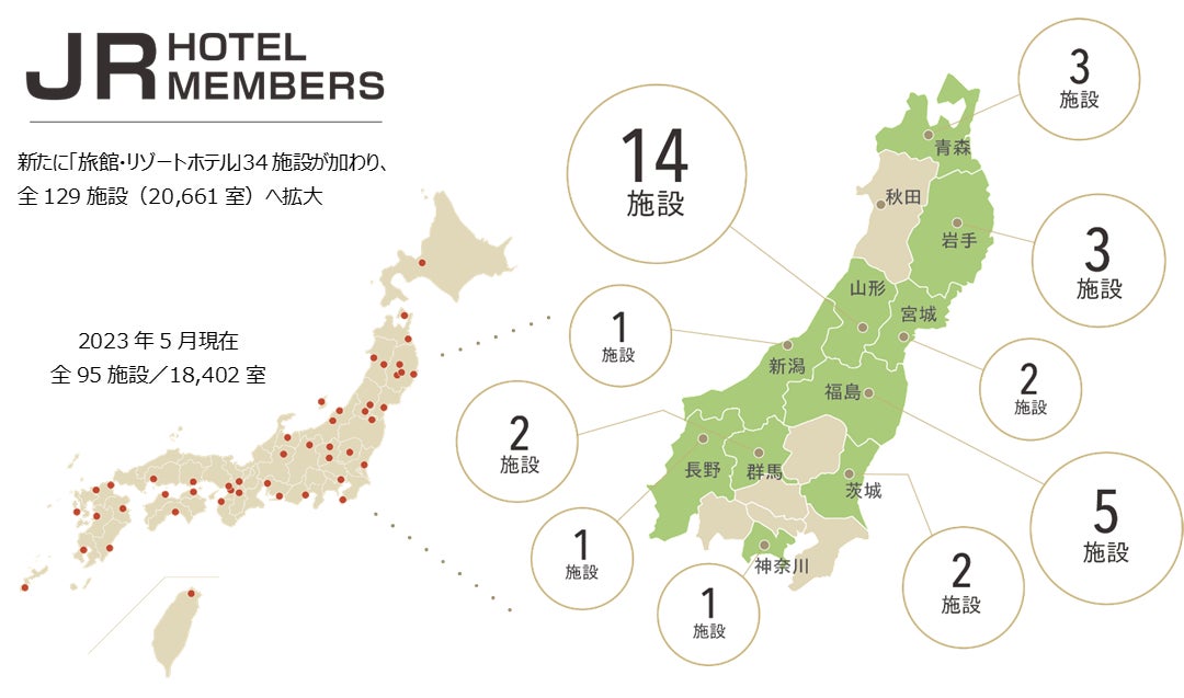 今回、新たに提携する34施設は、青森県から神奈川県まで東日本エリア10県にわたる各地域で長年愛される歴史深い旅館やリゾートホテルとなります。魅力的な旅館やリゾートホテルが加わることにより、ビジネスからレジャー利用まで目的の幅が拡がり、これまで以上にJRホテルメンバーズの魅力・価値を高めることにより、顧客満足度の向上を目指します。