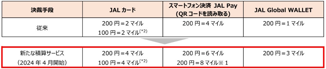 JAL PLAZA でのお買い物では、「JAL カード」、「スマートフォン決済 JAL Pay (QR コードを読み取る)」または「JAL Global WALLET」で決済いただくと、従来の積算率よりも高い率でマイルをためることができる新しいマイル付与サービスを、2024 年 4 月より開始予定です。