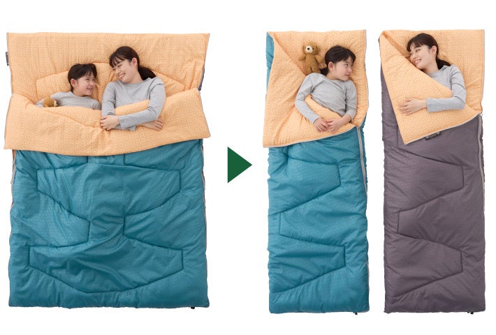 連結したダブルサイズの状態だと、親子で添い寝ができるので真っ暗なキャンプの夜も安心して眠ることができる。分けて使えば、2つの寝袋となり、お子様の成長に合わせて使い分けができる。