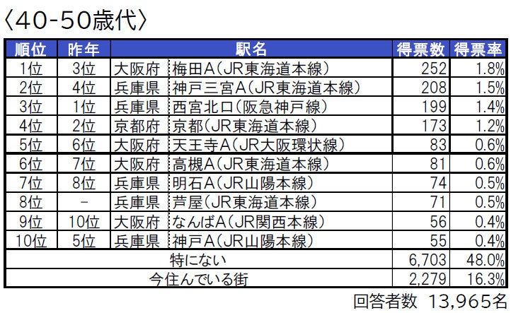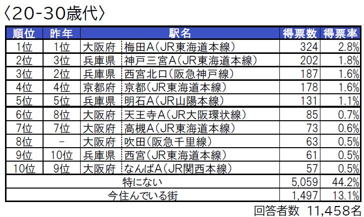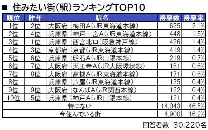 1位は、昨年2位だった梅田A(JR東海道本線)です。2位は、昨年4位の神戸三宮A(JR東海道本線)、3位は、昨年1位の西宮北口(阪急神戸線)です。トップ10内では、8位に芦屋(JR東海道本線)が新たにランクインしています。芦屋は「住みここち(自治体)」で、今年1位となっている芦屋市にある駅です。