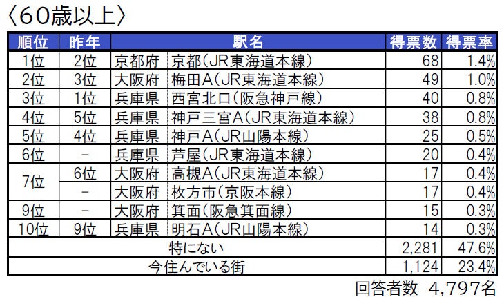 ●年代別では、トップ4までの顔ぶれはどの年代でも大きな違いはありませんが、20-50歳代の世代には繁華街で賑わう梅田Aが1位なのに対し、60歳代以上の年代には、商業施設が多く、交通の利便性も高い一方、寺院や歴史的建造物などがあり、落ち着いた雰囲気もある京都が1位となっています。