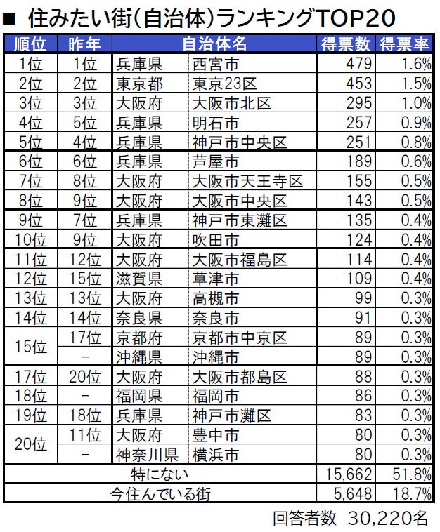 ■住みたい街(自治体)ランキングトップは、5年連続で兵庫県西宮市