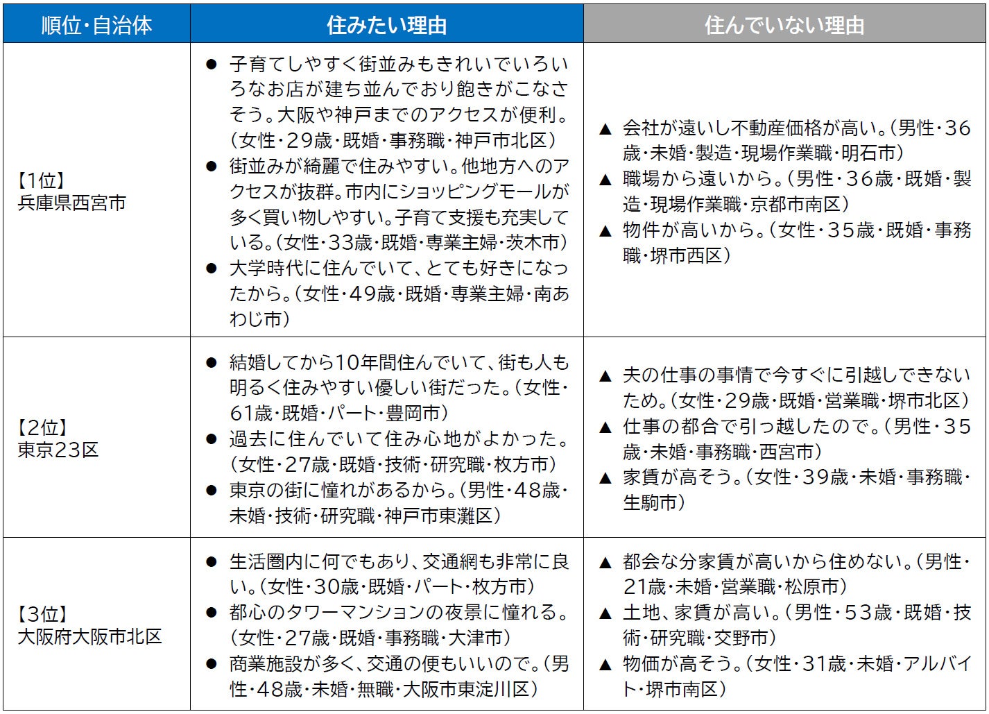トップ3の「住みたい街」を選んだ理由は、生活や交通の利便性が良い街であり、なおかつ街並みが綺麗、おしゃれな環境への憧れ等を挙げるコメントが多く見られます。一方で、「住んでいない理由」については、家賃の高さや通勤のしにくさ等を挙げるのコメントが多くなっています。