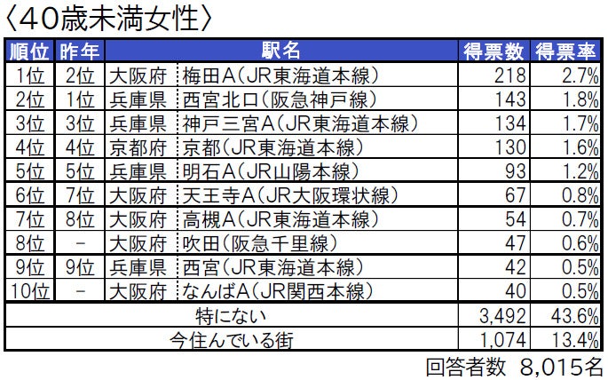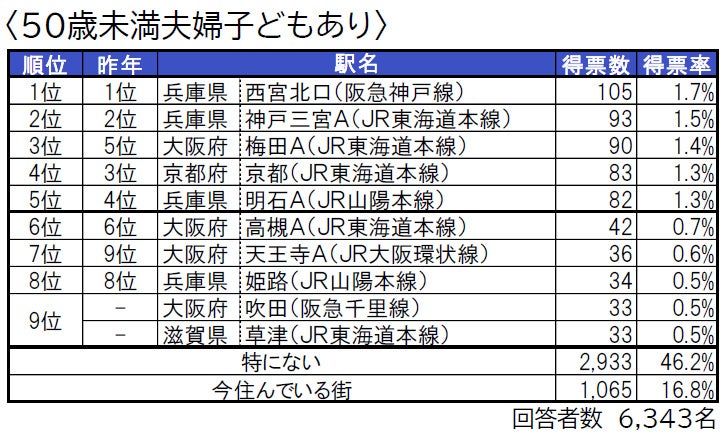 ●40歳未満の男性および女性では、梅田Aが1位ですが、50歳未満の夫婦子どもありの家庭では、昨年に引き続き落ち着いた街並みでおしゃれな商業施設が多い西宮北口が1位です。一方、トップ5は、順位の違いはあるものの、全ての属性で顔ぶれは同じとなっています。