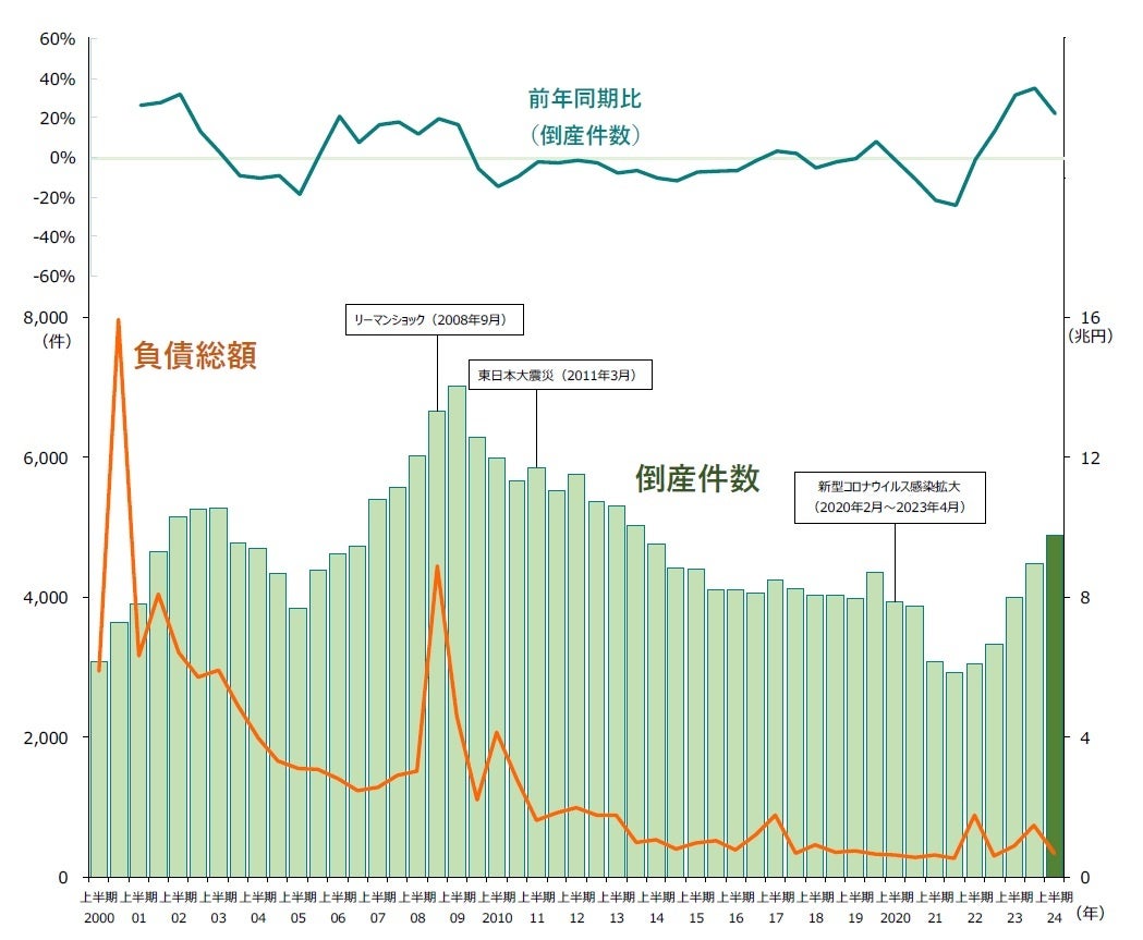 2024年上半期の倒産件数は4887件(前年同期4006件、22.0%増)と、前年同期に比べて881件多く、2年連続で前年同期を上回った。2014年上半期(4756件)以降で最多となった