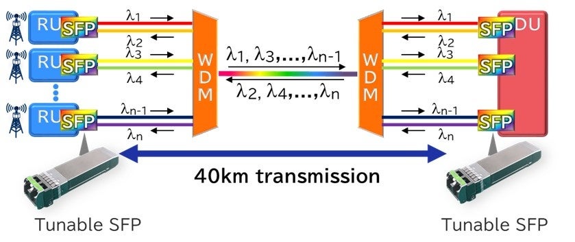加えて、本光トランシーバは、波長分割多重(WDM:Wavelength Division Multiplexing)方式に対応しており、一本の光ファイバに最大50波長を多重して伝送することができるため、光ファイバのコストを大幅に削減することが可能です。また、波長可変レーザーを搭載しており、1台で50波長すべてに対応することが可能です。このため、波長毎に個別の光トランシーバを準備する必要がなく、棚卸の削減や維持管理コストの削減が可能です。