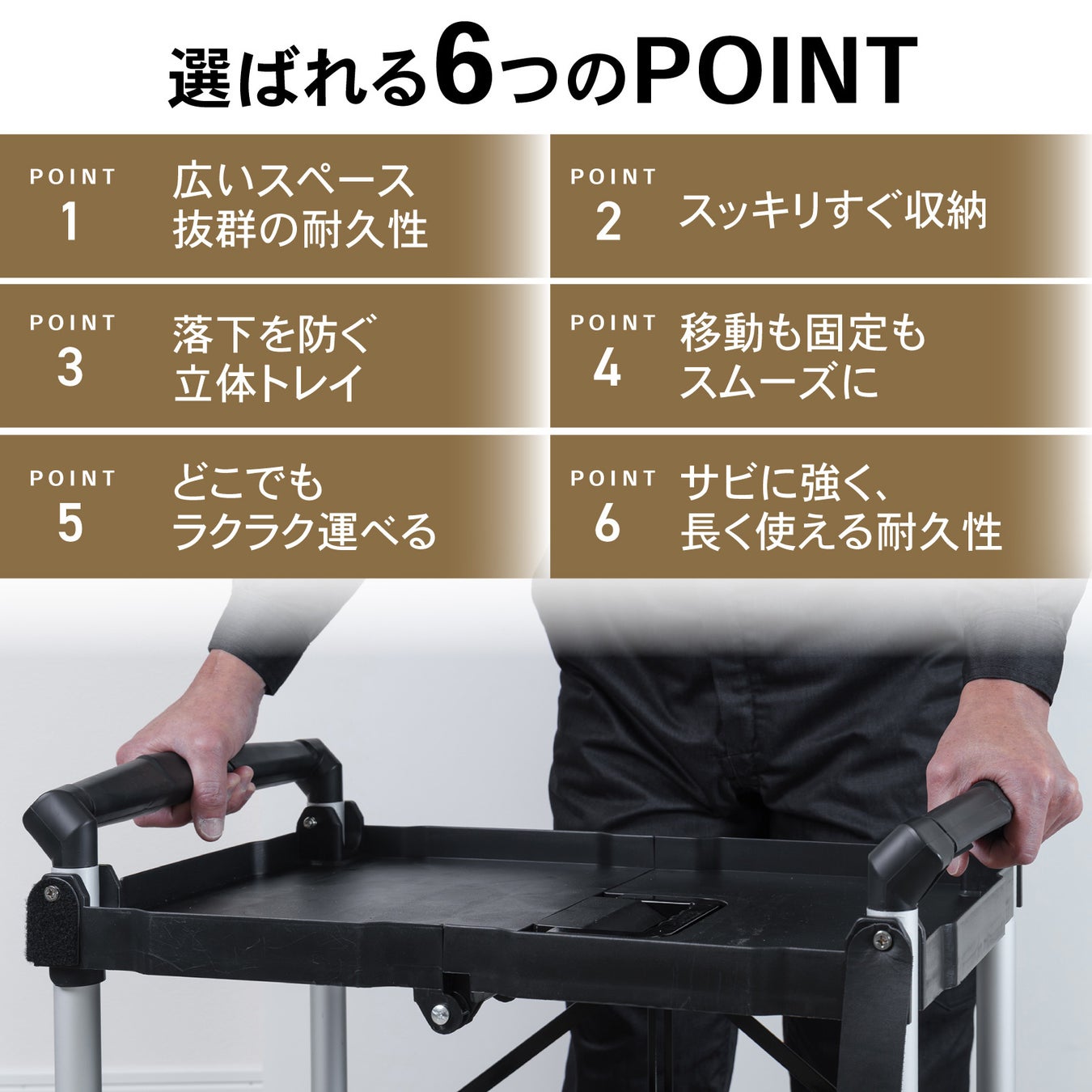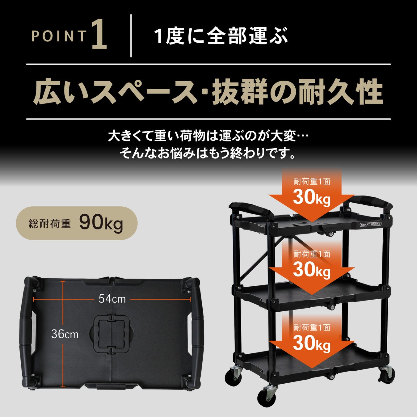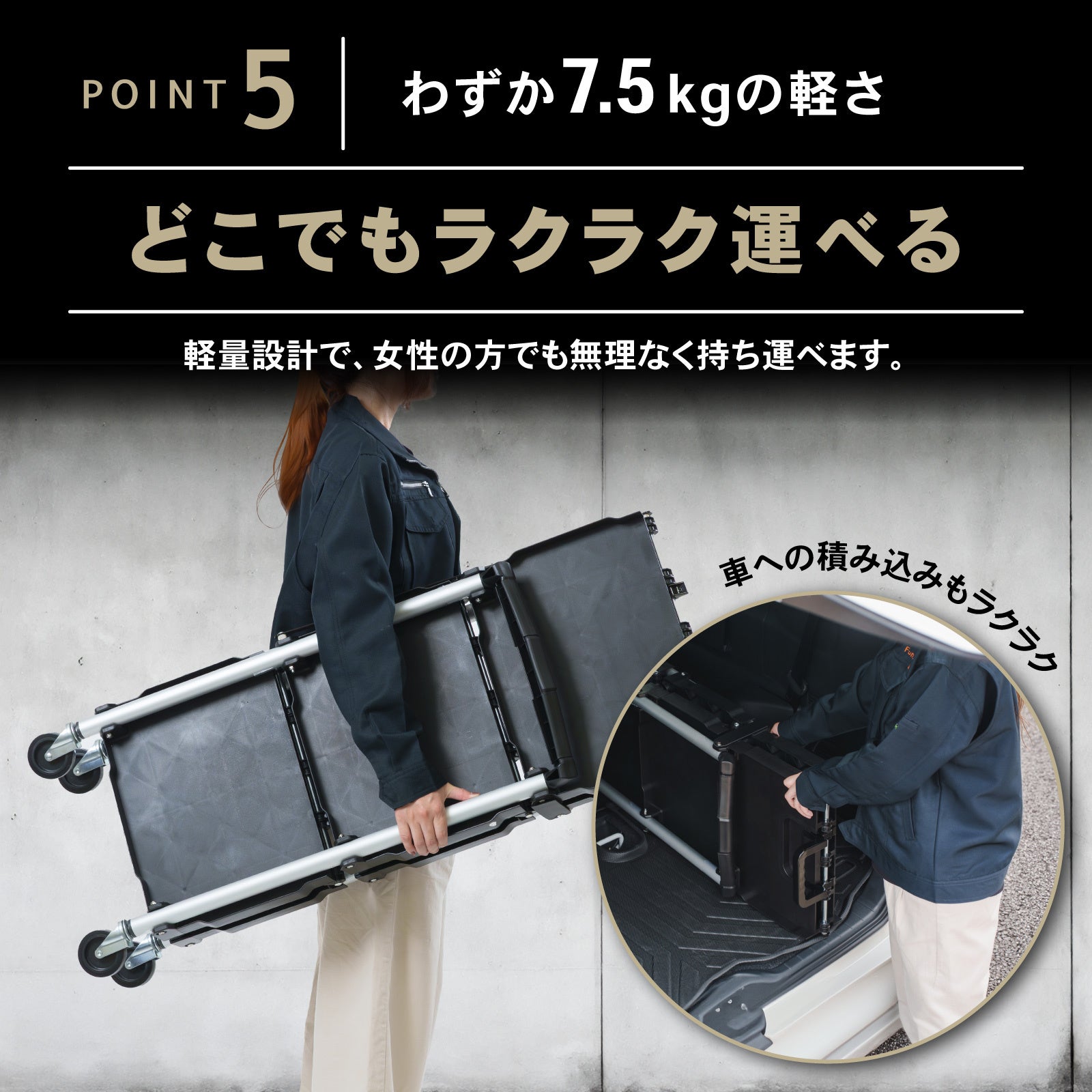 折りたたみ約1秒、3段設計。耐荷重は75kg/90kg/120kgの3タイプ。工具置き場からアウトドア、イベント運搬、調理の補助台、配膳、撮影台まで幅広く対応。現場に1台はほしい、作業の必需品。