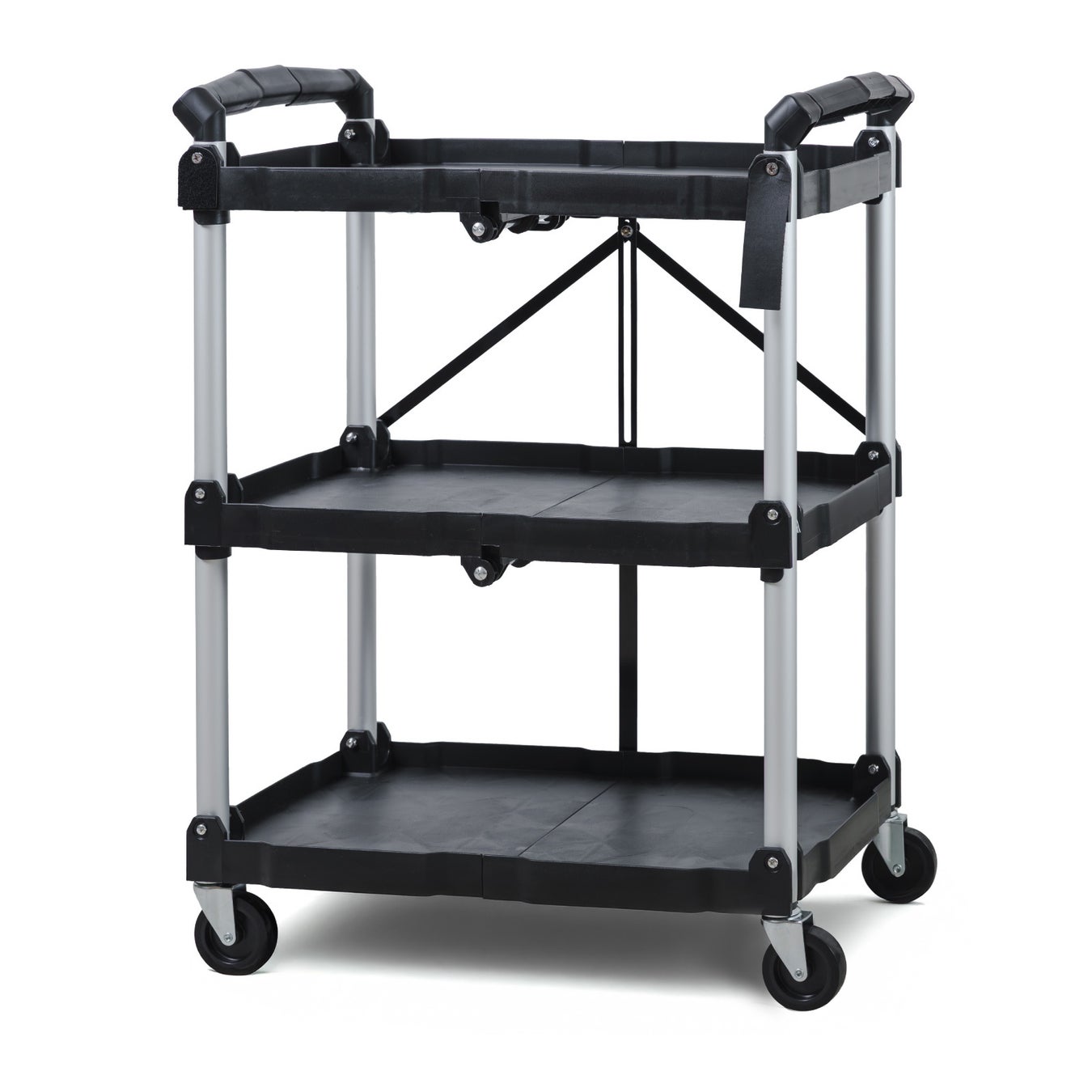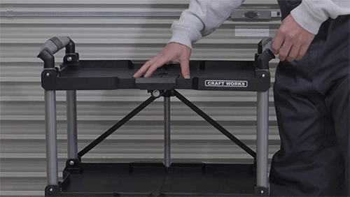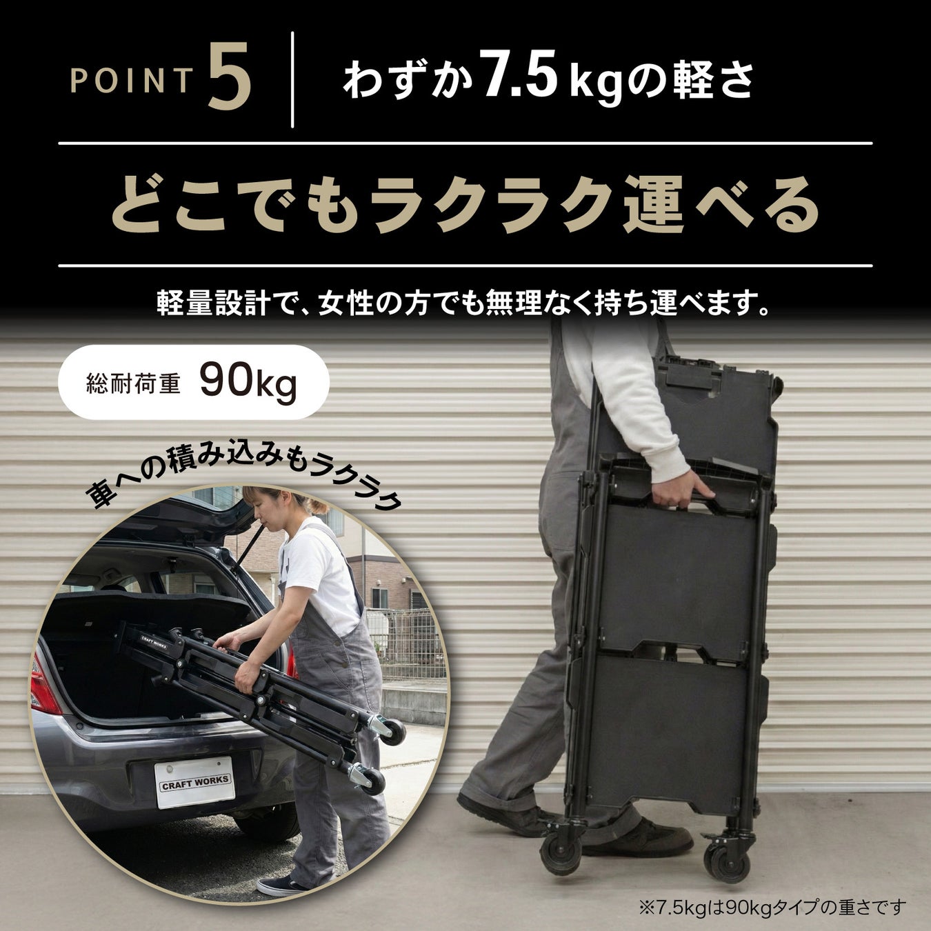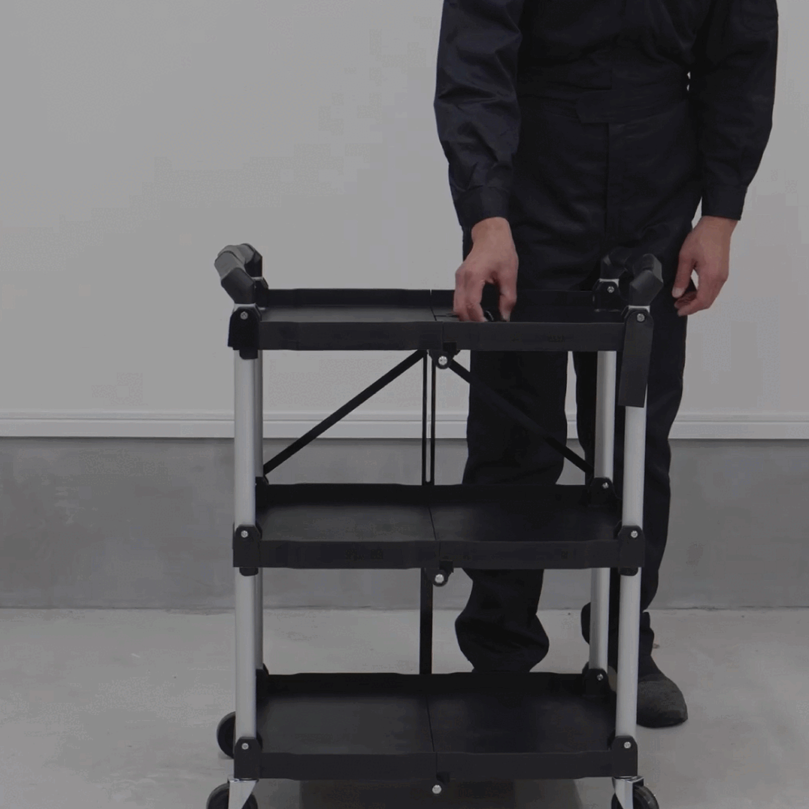 折りたたみ約1秒、3段設計。耐荷重は75kg/90kg/120kgの3タイプ。工具置き場からアウトドア、イベント運搬、調理の補助台、配膳、撮影台まで幅広く対応。現場に1台はほしい、作業の必需品。