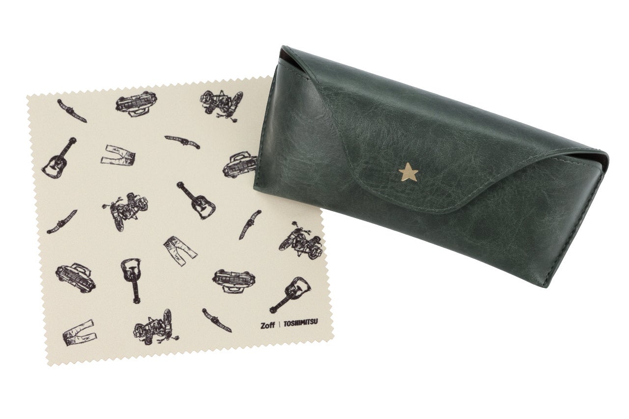 メンバーカラーの緑を採用したメガネケースと、としみつの嗜好品を本人描きおろしイラストでデザインしたメガネ拭き付き。