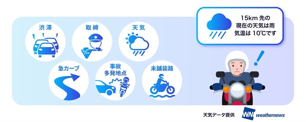 渋滞や取り締まり、強風、事故多発地点、未舗装道路、急カーブなどのリスク情報を、走行中に音声と画面表示で知らせます。また、株式会社ウェザーニューズの気象データと連携し、目的地の天気や気温だけでなく、ルート上15㎞先(約20分後)の天気情報も案内するため、雨などへ事前に備えることができます。「ツーリングマップル 2024年度版(株式会社 昭文社発行)」に掲載されている道路や関連施設などのコメント情報も案内します。