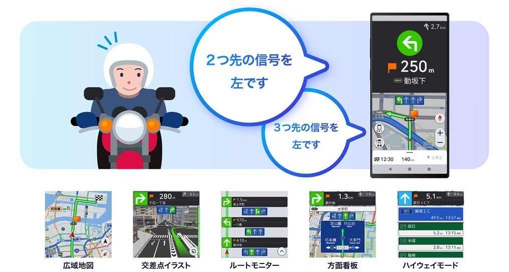 排気量区分別のルート探索(50ccを除く)や、信号数のカウント、右左折ポイント、交差点の情報など、バイク向けに最適化されたきめ細かいナビゲーションを、分かりやすい音声案内とシンプルで見やすい画面表示で行います。また、「急カーブ地点」や「渋滞」「天気」などの走行中のリスクや不安を軽減して安全な走行をサポートする情報や、「全国のツーリングコース」や「付近の観光スポット」「景観スポット」などツーリングの楽しみを広げる情報で、ライダーへ新しい価値体験を提供します。