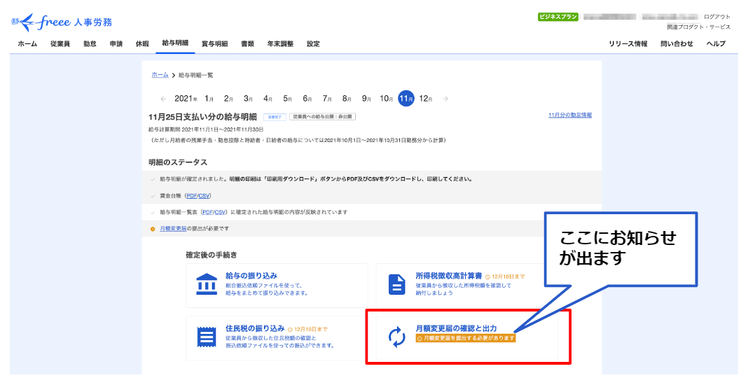 ・月額変更届の場合、下記のように画面上で、月額変更届が必要であることが表示されます。