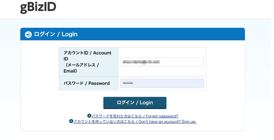 ・gBizIDのログイン画面が開くので、事前に取得したIDとパスワードを入力します。