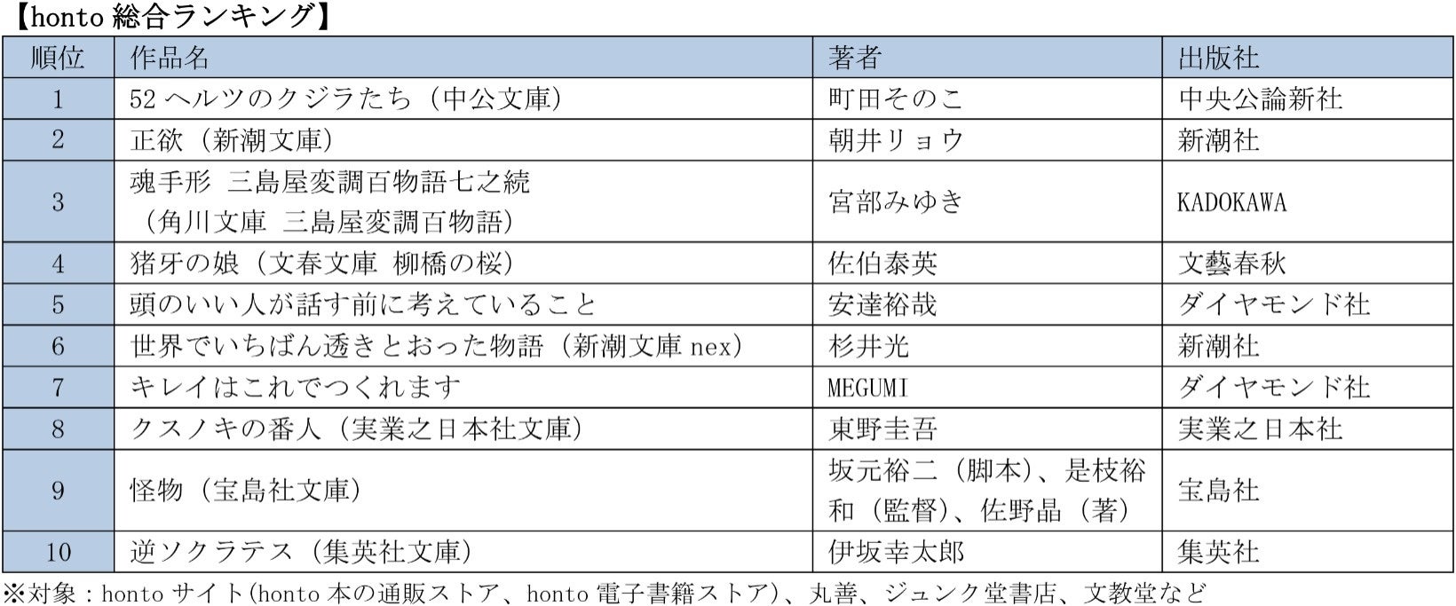 hontoランキングは、honto サイトと、honto サービス実施店の丸善、ジュンク堂書店、文教堂などで購入された書籍や電子書籍の販売データをもとに集計しています。