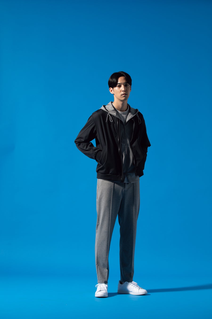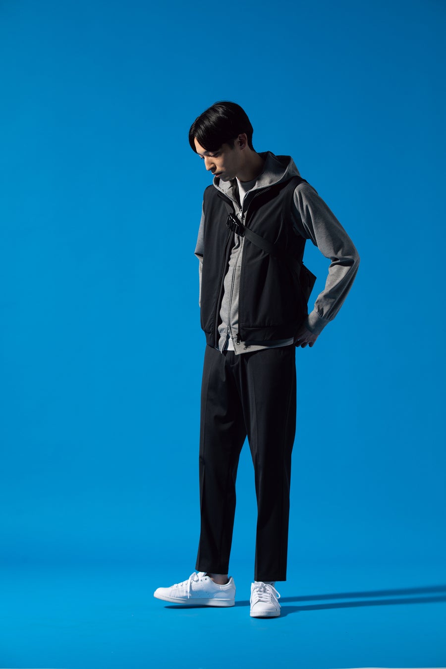 『スポーティーカジュアル』のベストとパーカーのスタイリングは、カジュアルな印象になりつつも、クールタッチジャージの上品な艶感のある素材と、パンツのやや細身なシルエットにより「きちんと感」もあるカジュアルスタイリングです。