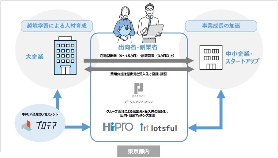 パーソルキャリアが運営する「HiPro」は、副業・フリーランスといったプロ人材活用における実績やノウハウを活かし、東京都内の中小企業・スタートアップ企業の課題や状態に合わせて、大企業から輩出される副業実施者をマッチングし人材交流支援を行います。