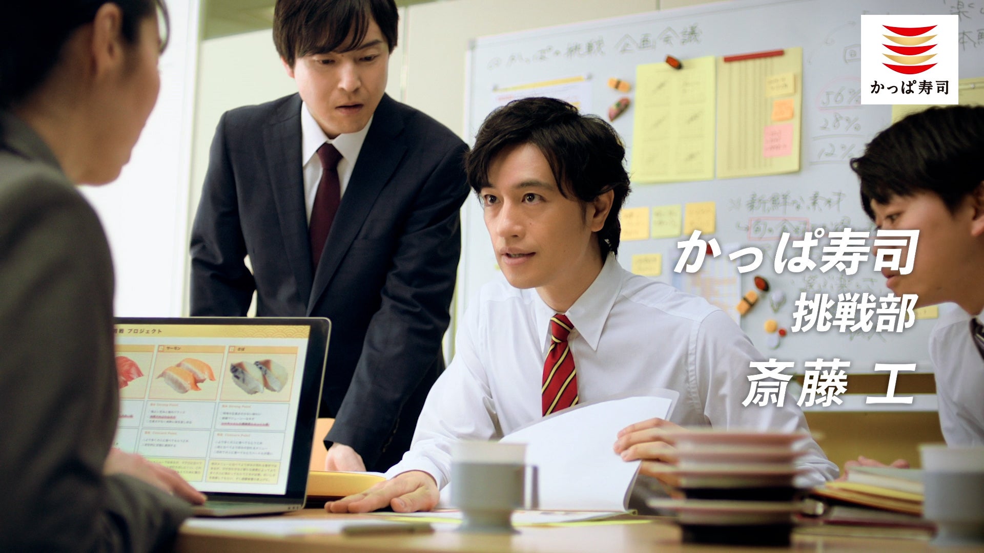 ・内容:かっぱ寿司の"挑戦部"社員と扮する俳優の斎藤工さんが、お客様の日々に寄り添い、もっとワクワク」をお届けするために、商品・企画案を練っていく内容となっております。「もっと喜んでもらいたいんです!」という斎藤さんの熱い姿とともに、『大特価!本鮪中とろ』『うに軍艦』や『蟹いくら軍艦』といったおすすめネタを声優の下野さんのナレーションでお届けします。