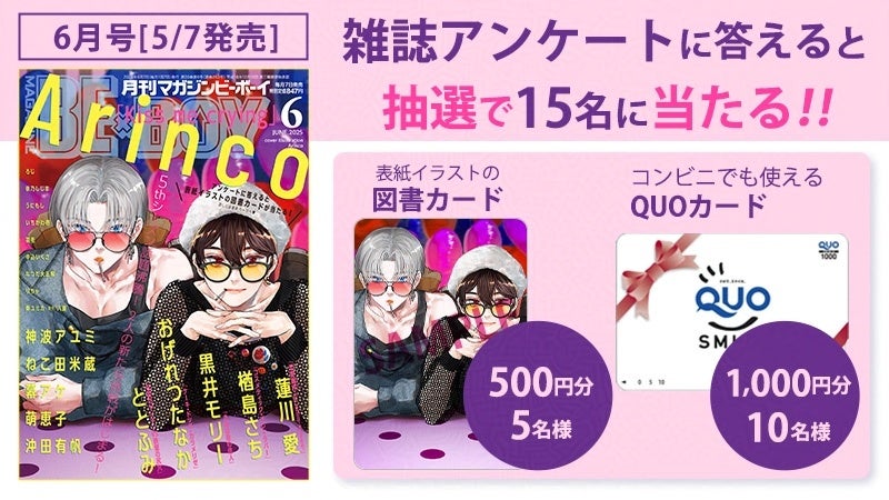 株式会社リブレ(本社:東京都新宿区、代表取締役社長:是枝由美子)は、Arinco先生が表紙の雑誌「マガジンビーボーイ2025年6月号」を5月7日に発売いたします。https://www.b-boy.jp/magazine/226288