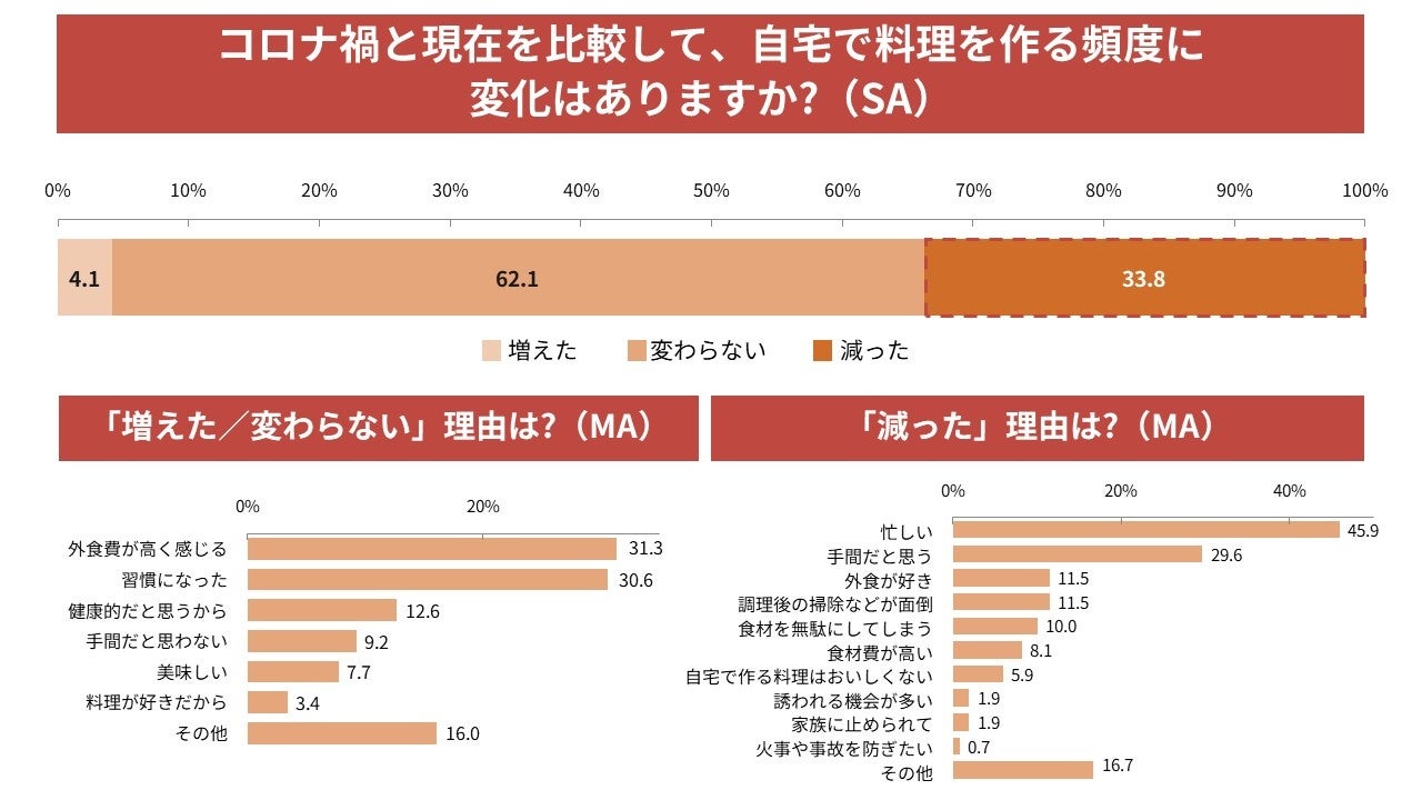 コロナ禍では外食がしにくく自宅での料理が増えていたと考えられます。そこで、「コロナ禍と現在を比較して、自宅で料理を作る頻度(朝・昼・夕問わず)に変化はあるか」を聞いたところ、33.8%が「減った」と答えました。減った理由については、「忙しい」が最も多く45.9%となりました。次いで約3割が「手間だと思う」(29.6%)と答えました。