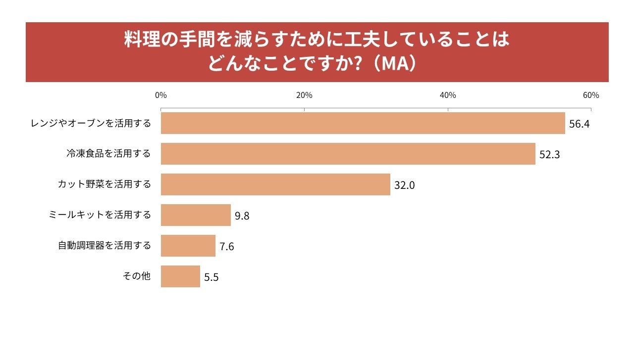 《料理の手間を減らすための工夫は、レンジやオーブンの活用が56.4%と最多。冷凍食品の活用も52.3%となり、半数以上が家電や冷凍食品を活用している。》