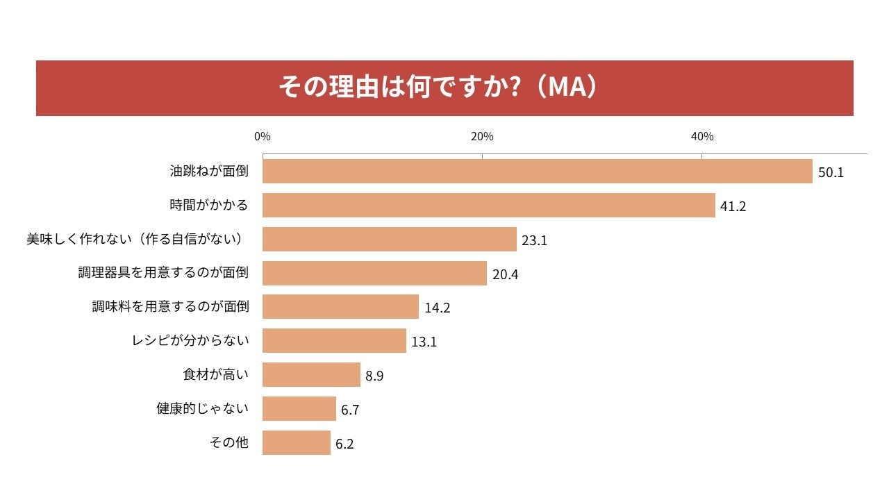 その理由を聞いたところ、半数が「油跳ねが面倒」(50.1%)と答え、4割以上が「時間がかかる」(41.2%)と回答しました。「美味しく作れない(作る自信がない)」(23.1%)や「調理器具を用意するのが面倒」(20.4%)という回答も2割を超えています。油の処理、特別な調理道具の準備や鍋やフライパンが複数個必要など、調理工程の煩雑なものは避けたい気持ちが表れています。毎日の食事に対しては調理から片付けまでをなるべく手軽に済ませたいのではないかと考えられます。