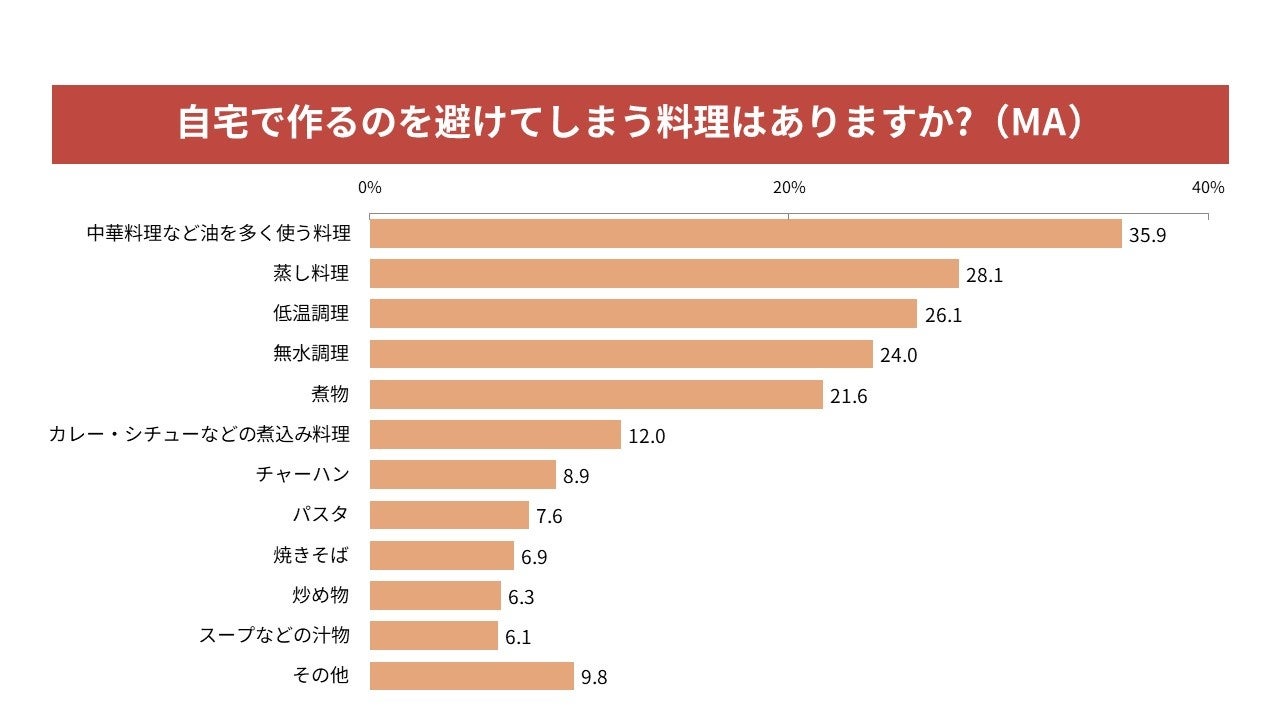 「自宅で作るのを避けてしまう料理はありますか」という質問で、35.9%もの人が「中華料理など油を多く使う料理」と回答しました。「蒸し料理」(28.1%)、「低温調理」(26.1%)、「無水調理」(24.0%)、「煮物」(21.6%)なども、挙げられています。