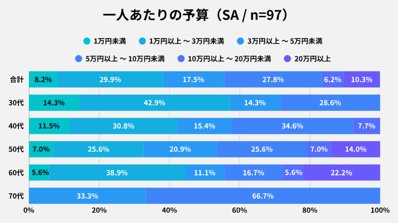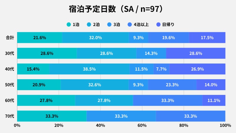 予算や宿泊数は年代が上がるにつれて増加する傾向にあり、特に40代以降は 「4泊以上」 の割合が増え、一人当たり 「5万円以上」 の予算をかける層も厚くなります。旅行に行くからには、時間もお金もかけて 「旅の質」 を追求したいという “メリハリ消費” の意識がうかがえます。