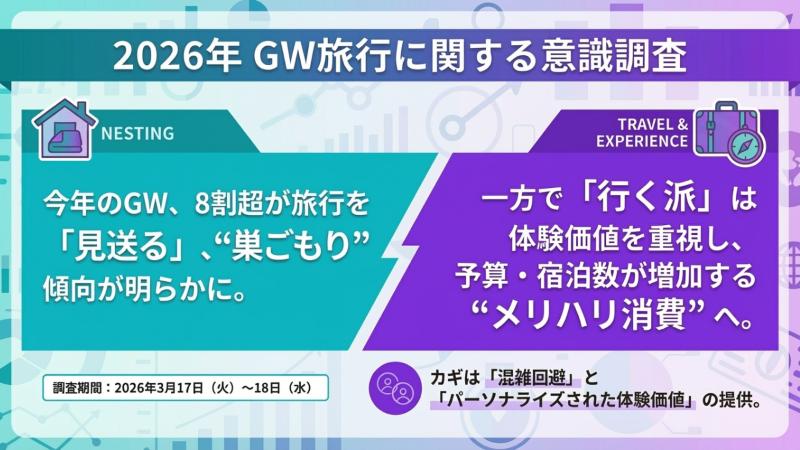 今回の調査から、2026年のGWにおける生活者の過ごし方は、 「混雑を避け、静かに過ごしたい “巣ごもり派” 」 と、 「費用と時間をかけてでも特別な体験をしたい “こだわり体験派” 」 に大きく二極化する様子が明らかになりました。