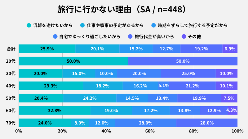 旅行に行かない理由は、年代ごとに特徴が見られました。20代~50代では年代が上がるにつれて 「仕事や予定の時間があるから」 が増加し、多忙な現役世代の姿がうかがえます。一方、60代以降では 「自宅でゆっくり過ごしたいから」 「旅行代金が高いから」 が増加。物価高の影響を受けつつ、慌ただしい旅行よりも心身の安らぎを重視するシニア層の価値観が見えてきました。