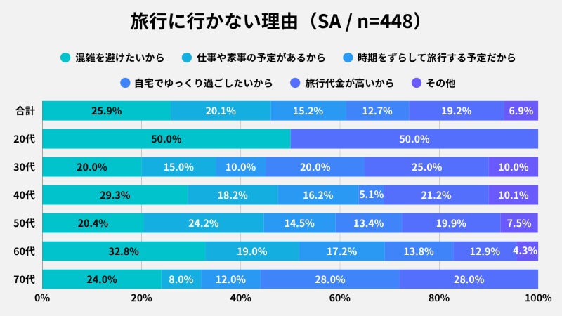 「GWに旅行に行く予定はあるか」 という質問に対し、全体で82.2%が 「いいえ (行かない) 」 と回答。年代別に見ても、最も割合の低い30代で74.1%、20代では100%が 「行かない」 と回答し、大型連休中の旅行を控える傾向が顕著となりました。 「行かない理由」 としては、全ての年代で 「混雑を避けたいから」 が上位を占め、人混みを避けて快適に過ごしたいという意識が強く表れています。