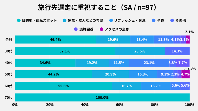 旅行に求めるものは 「目的地・観光スポット」 、予算や予定泊数は年代別で変化あり。
