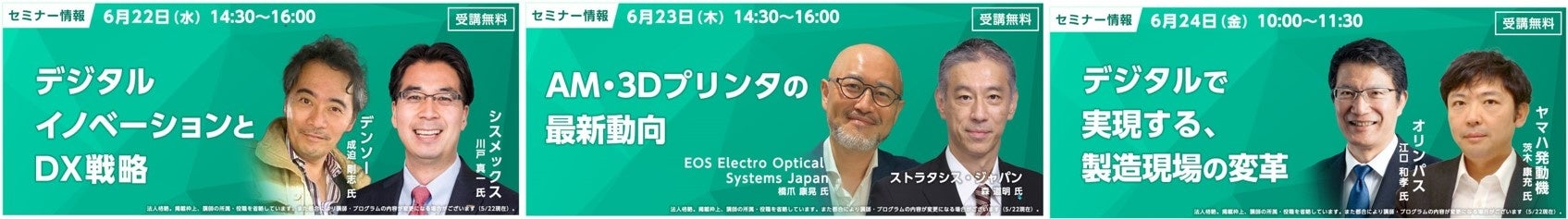 製造業におけるDX推進、開発・製造事例、XR技術・3Dプリンタの最新動向などを学べるセミナーが満載。豪華講師陣が連日登壇し、企業事例や最新動向を学べます。設計・研究・開発、製造・生産技術、品質、DX推進、情報システム部門など、製造業の方々必聴の内容となっております。ぜひご来場ください。(※事前申込制。定員になり次第、締切)