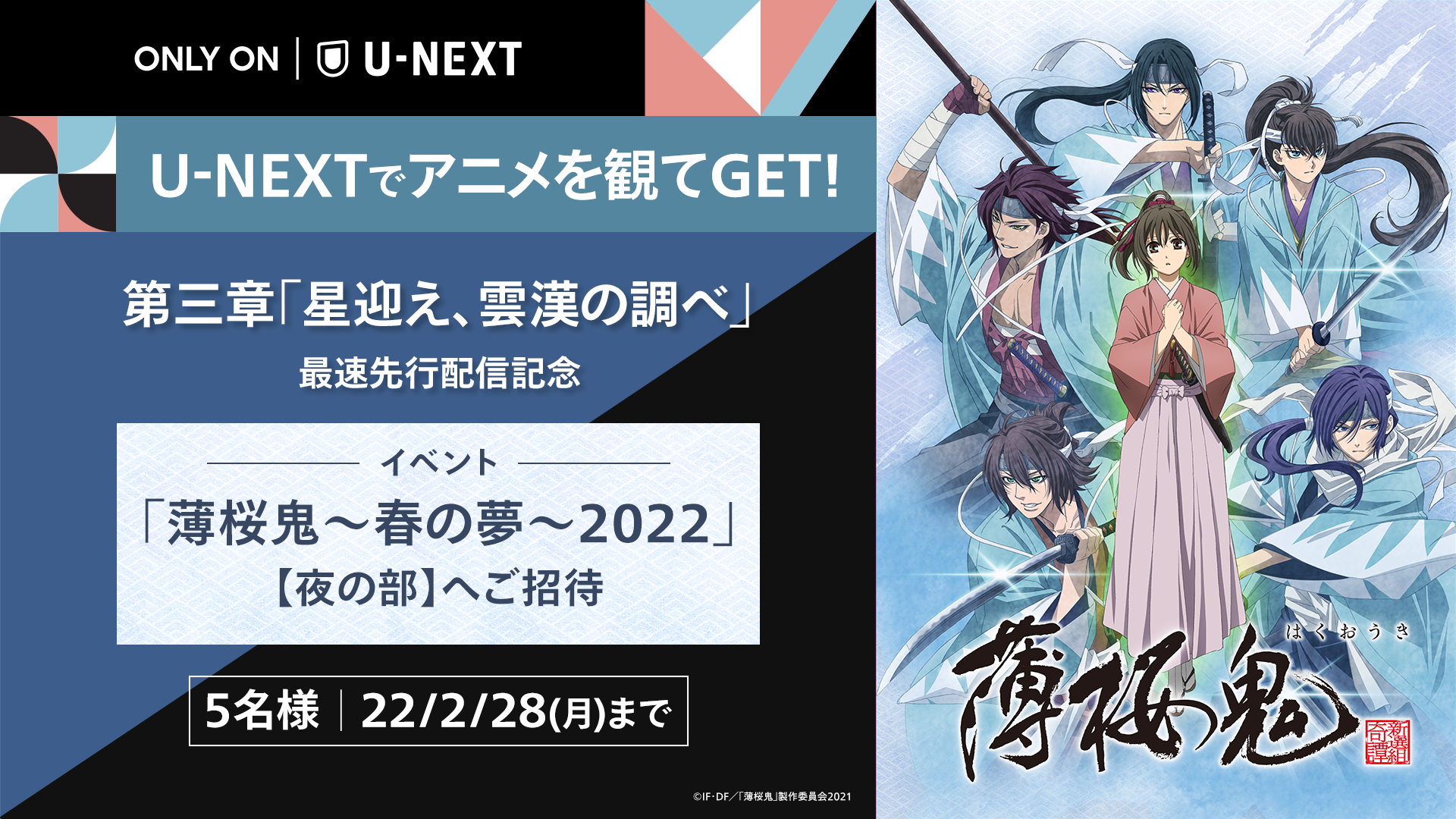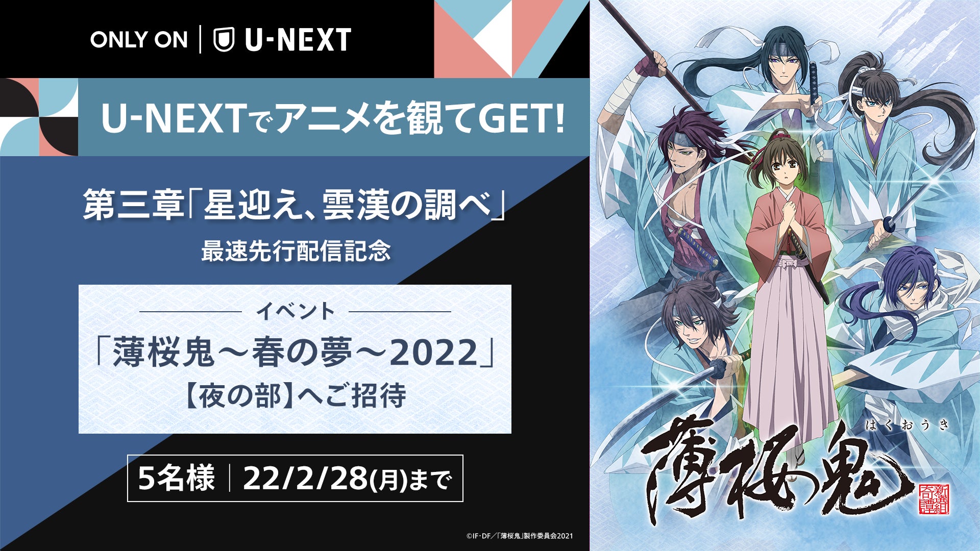 また、第3章の配信開始を記念して、本作をU-NEXTで視聴された方を対象に、2022年3月19日(土)に開催されるイベント「薄桜鬼~春の夢~2022<夜の部>」のご招待チケットが当たるプレゼントキャンペーンを実施いたします。ぜひ、ふるってご応募ください。