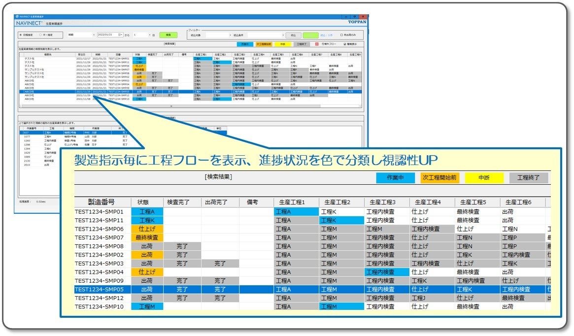 凸版印刷株式会社(本社:東京都文京区、代表取締役社長:麿 秀晴、以下 凸版印刷)は、幅広い業界/業種向けの製造DX支援ソリューション「NAVINECT®(ナビネクト)」を2019年4月より提供しています。このたび「NAVINECT®」に、RFIDを活用することで生産情報のデジタル化を行い、製造工程の進捗をタイムリーに見える化する機能を追加。工程管理の質を向上させるとともに管理業務の省力化を可能にする生産実績管理機能として、2022年3月上旬より本格的に提供を開始します。
