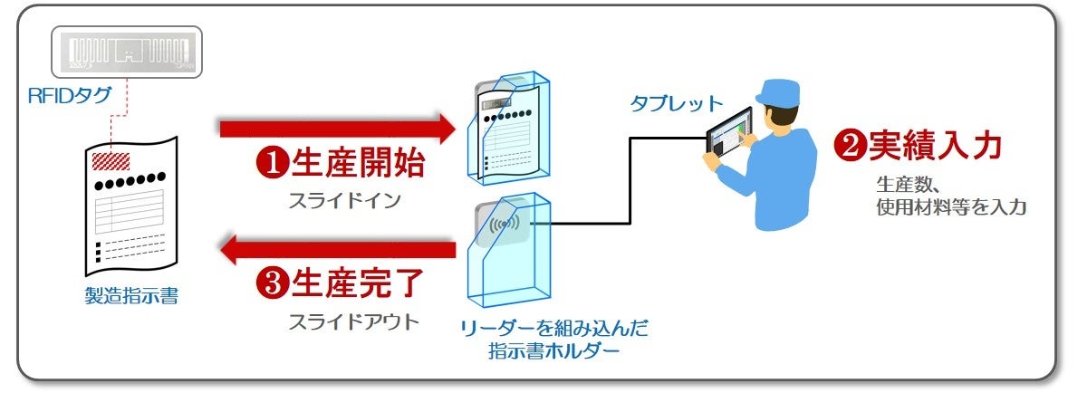 指示書にRFIDを貼付し、製造開始時に指示書を指定ホルダーに挿入することで、生産開始情報