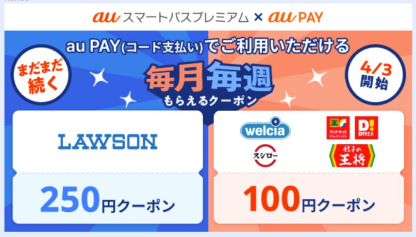 毎週月曜更新!auスマートパスプレミアム、4・5月の「毎週もらえるクーポン」~ウエルシア、サンドラッグ、スシロー、餃子の王将のau PAYで使える、100円割引クーポンを週替わりで提供~