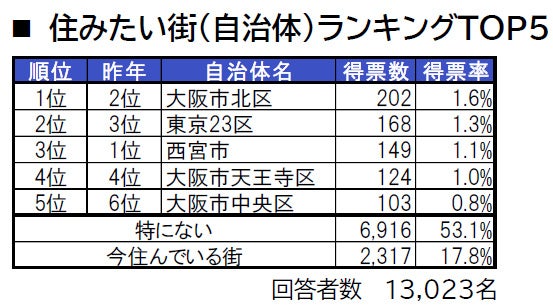 大阪市北区が、昨年2位から順位を上げて1位です。2位は東京23区、3位は西宮市です。トップ3は、順位の変動はあるものの、顔ぶれは同じという結果になっています。