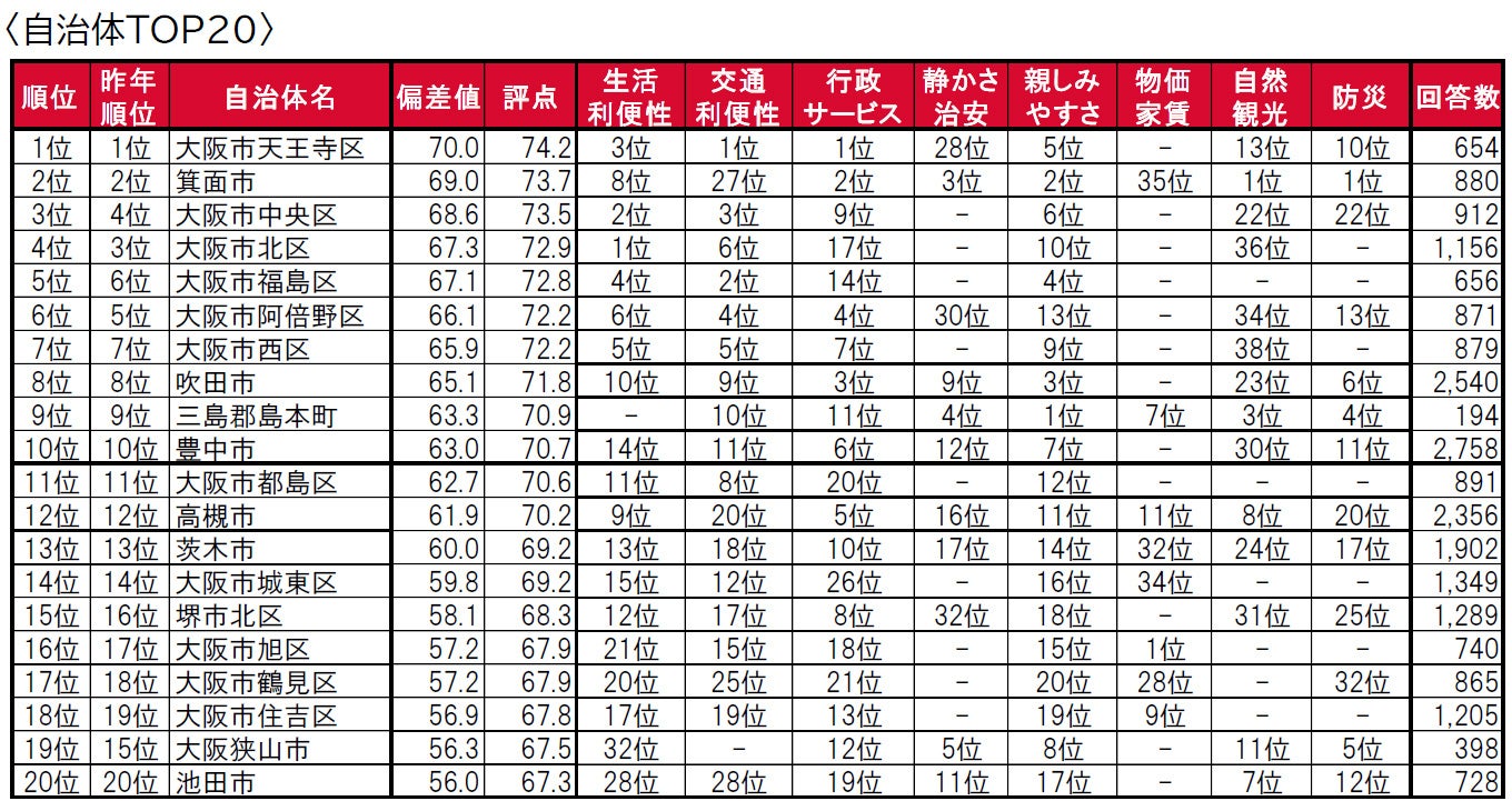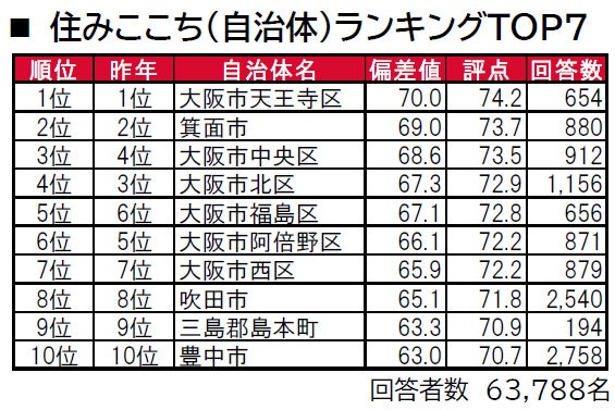 大阪市天王寺区が唯一偏差値70台の高い評価で、5年連続1位に輝きました。2位は、4年連続で箕面市です。3位は、昨年は4位だった大阪市中央区です。トップ10内の自治体は、順位の変動はあるものの、顔ぶれは同じという結果になっています。