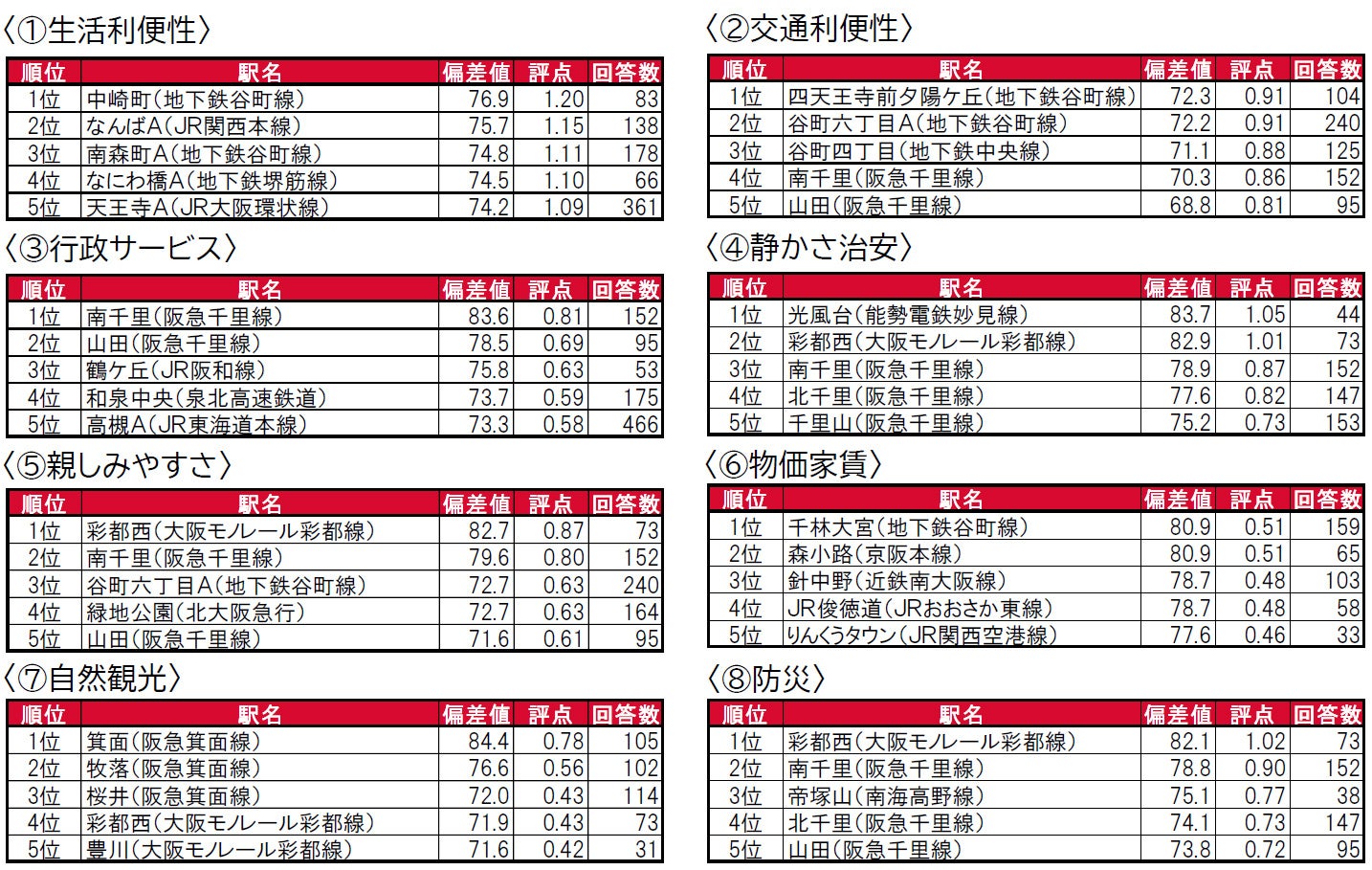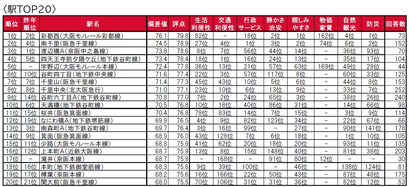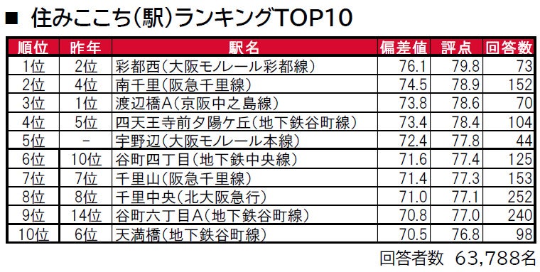 1位は彩都西(大阪モノレール彩都線)で、昨年2位から順位を上げました。2位は、昨年4位の南千里(阪急千里線)、3位は、昨年1位だった渡辺橋A(京阪中之島線)です。トップ10内では、昨年は累計回答数が30名未満だったためランキング集計対象外だった宇野辺(大阪モノレール本線)が5位にランクインしています。1位~11位までの駅は、偏差値70台の高い評価を得ています。