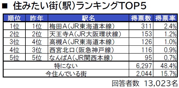 ■住みたい街(駅)トップは、5年連続で梅田A(JR東海道本線)