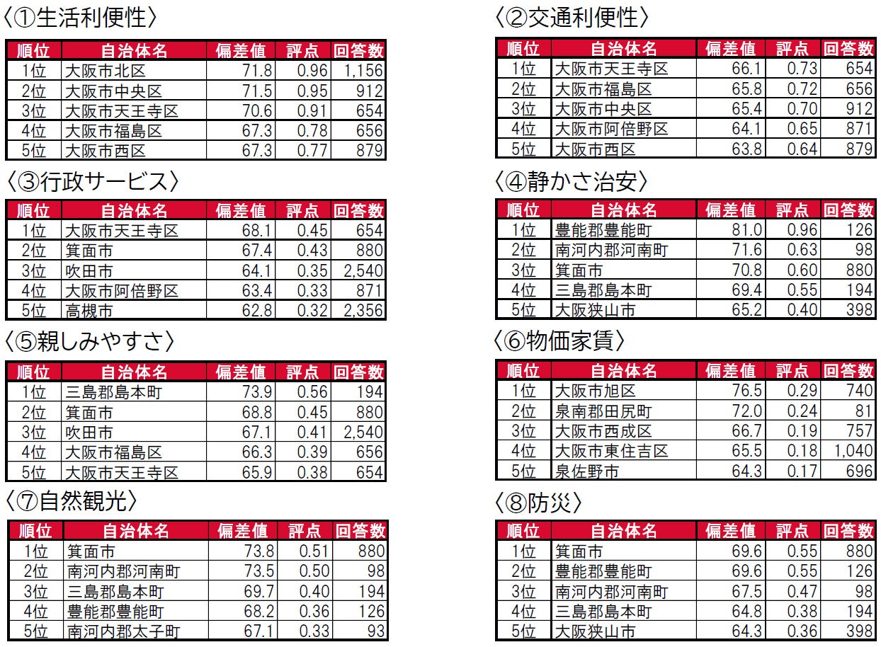 ●「生活利便性」「交通利便性」の両因子では、いずれも大阪市中心部の評価が高く、昨年に引き続きトップ5はすべて大阪市の自治体という結果になっています。