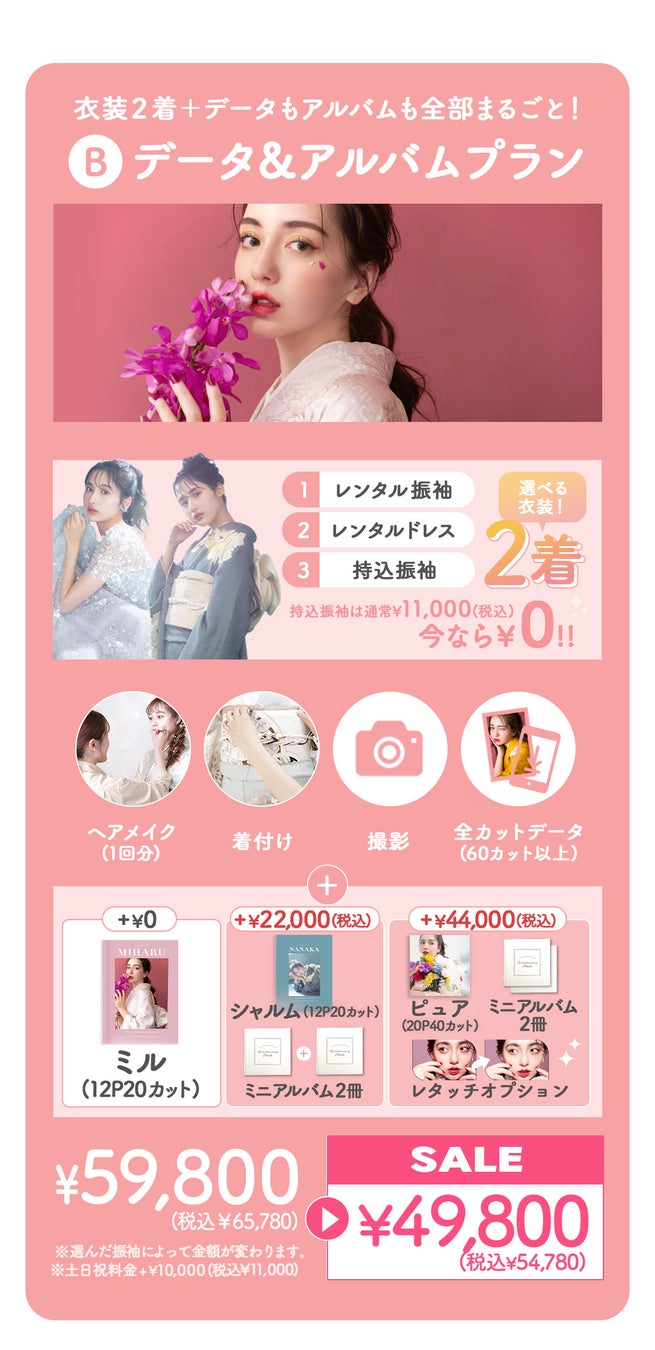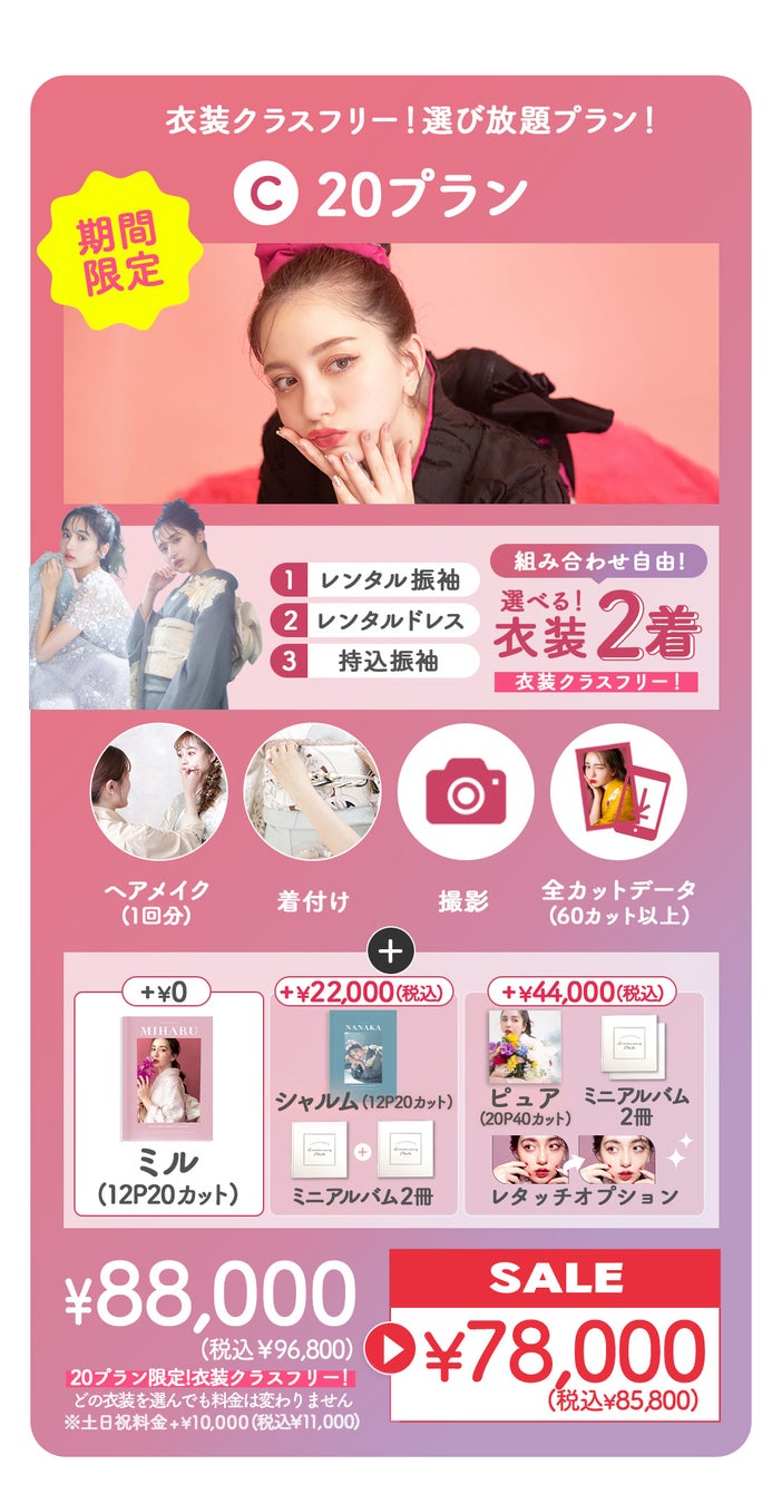 コミコミ20プランは成人式振袖レンタル+撮影のセットプランで、衣装が追加料金なしのクラスフリー。3万円以上が割引になっています。