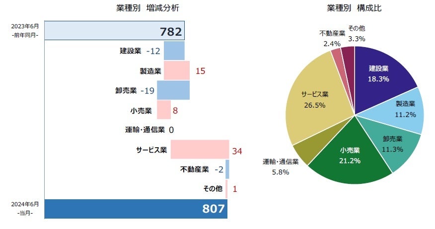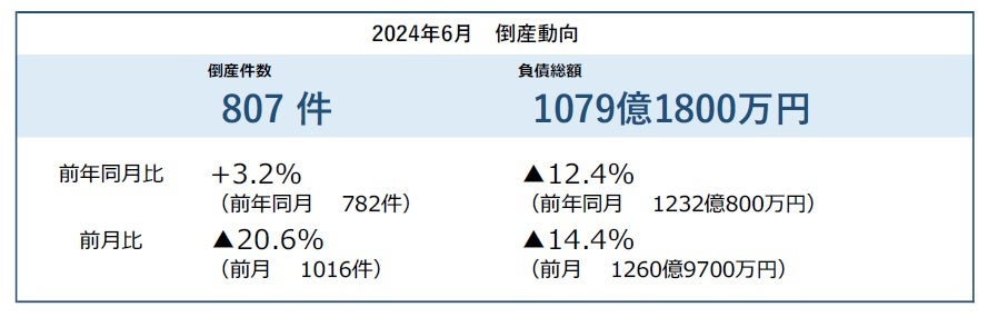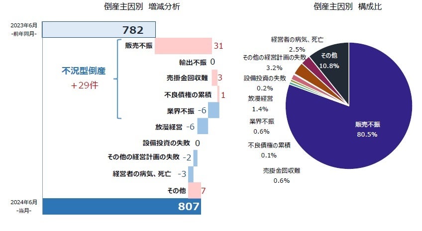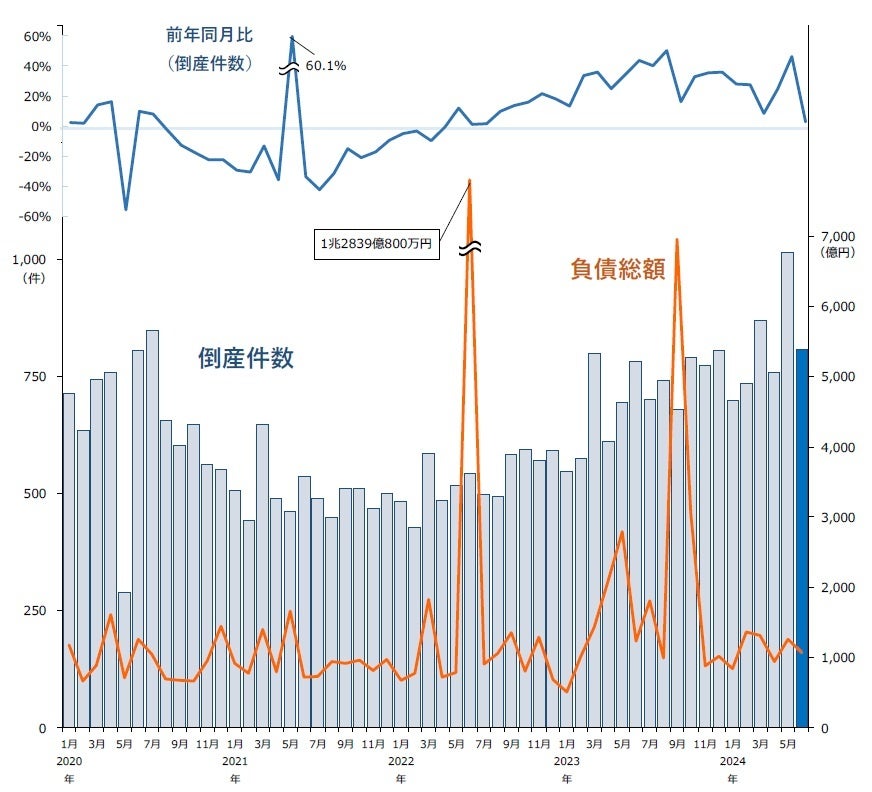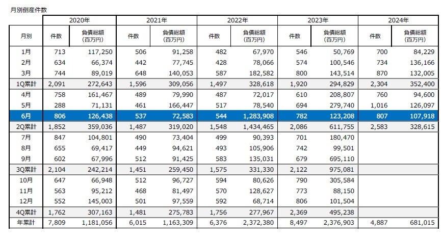 2024年6月の企業倒産807件、26カ月連続で前年同月を上回る 6月としては過去10年で最多 ― 全国企業倒産集計2024年6月報