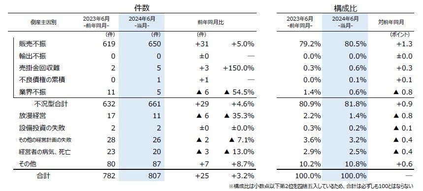 主因別にみると、『不況型倒産』の合計は661件となり、26カ月連続で前年同月を上回った
